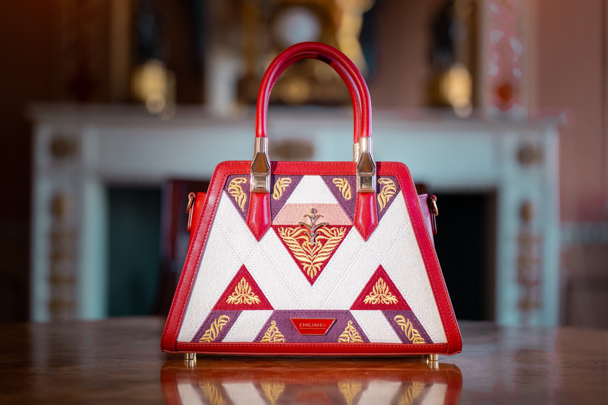 De tassen komen overeen qua vorm en materiaal, maar verschillen qua kleur en symboliek. De Aemilianus-tas met dieprode en gouden accenten, geometrische panelen en sierlijk borduurwerk belichaamt (daad)kracht, ambitie en vooruitgang.