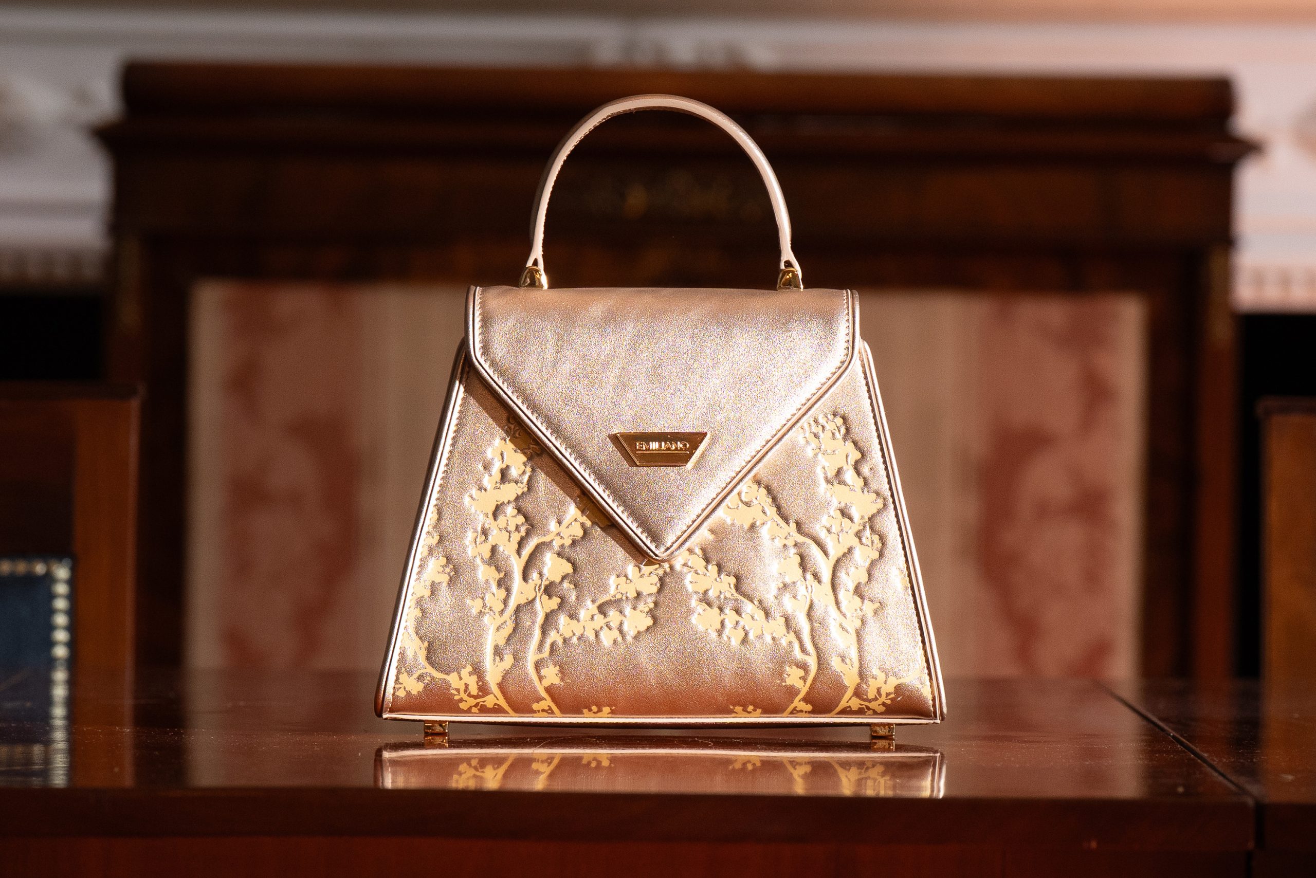 De volledig gouden Caesarea-tas is een meer zachte, maar alsnog stralende blikvanger, met geborduurde bloesem als elegante afwerking. Het symboliseert licht, transformatie, verheffing en spirituele rijkdom.