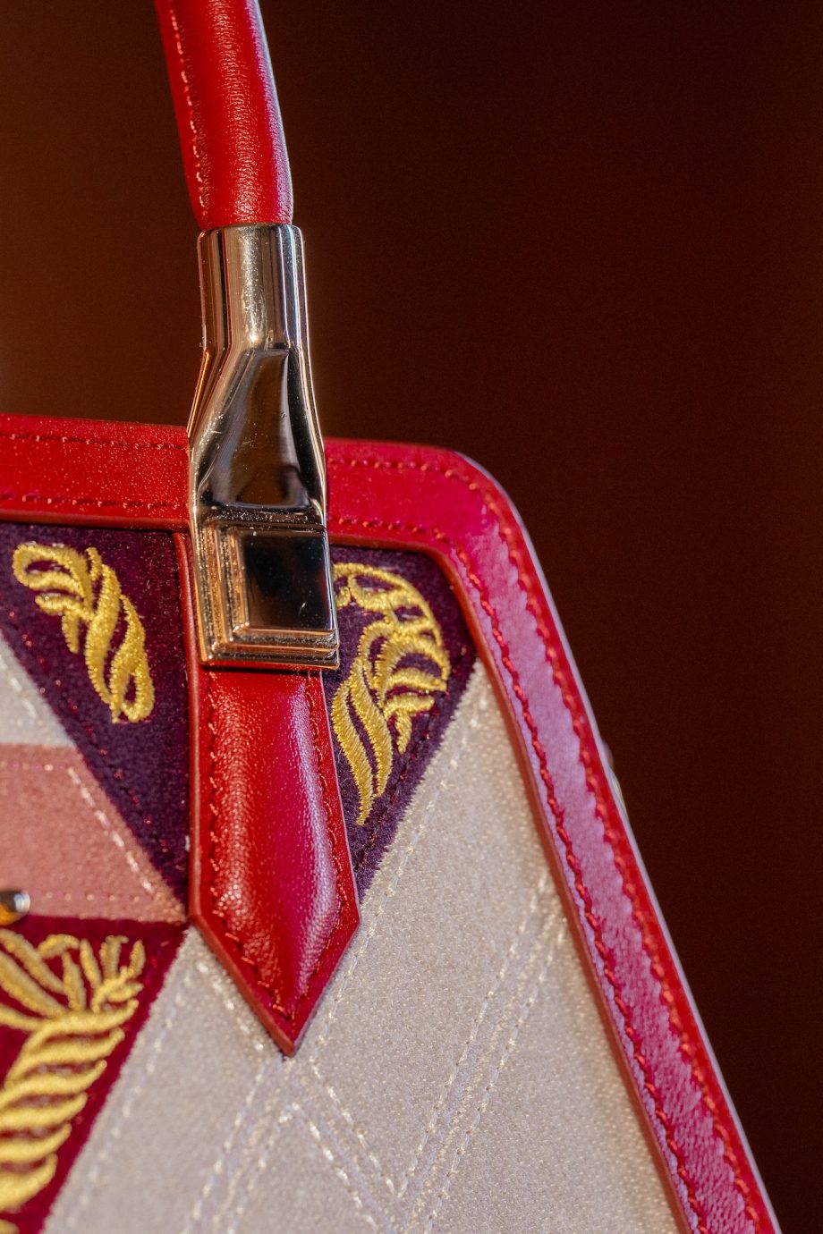 De tassen komen overeen qua vorm en materiaal, maar verschillen qua kleur en symboliek. De Aemilianus-tas met dieprode en gouden accenten, geometrische panelen en sierlijk borduurwerk belichaamt (daad)kracht, ambitie en vooruitgang.