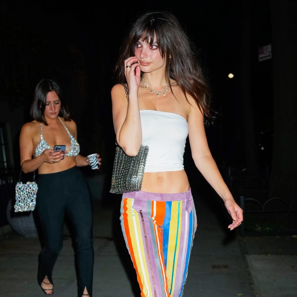 Emily Ratajkowski channelt Carrie Bradshaw in bandeautop en regenboogbroek