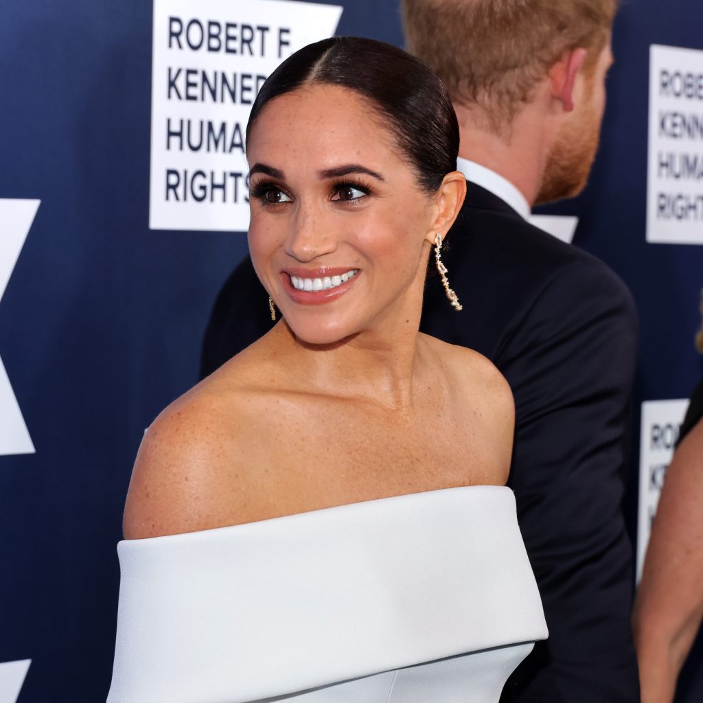 Meghan Markle is het toonbeeld van feestelijk chic in off-shoulderjurk van Louis Vuitton