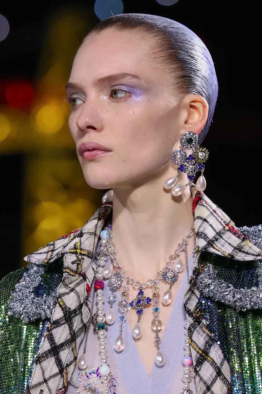 Gekleurd haar bedekt met glitters, vastgebonden in een lage glanzende knot of extra lang, golvend wit haar, besprenkeld met blauw, roze en turkoois (en dan gecombineerd met glitteroogschaduw): dat is de zeemeerminnenlook van Chanel. Het ultieme detail van deze beautylook, van make-upartiest Lucia Pieroni en haarstylist Duffy? Zelfs de lippen van de modellen werden bedekt met een glanzende gloss met glitters.