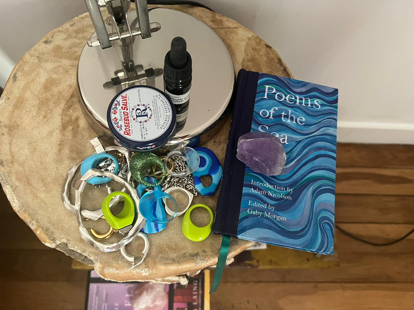 De dingen die op mijn nachtkastje liggen, zijn spullen die ik ook meeneem ergens naartoe om mij thuis te voelen. Sieraden van mijn beide oma’s, maar ook die ik van vrienden heb gekregen en kleine objecten, die ik verzameld heb tijdens het reizen of andere mooie momenten. Verder een paar dingen die ik heel fijn vind: sowieso lavendelolie van De Tuinen, maar ook de Rosebud Salve Lippenbalsem, Palmer’s Shea Formula Hand Cream en Prescription van Soap Treatment Store. Dat druppel ik voor het slapengaan op oneffenheden op m’n huid, de volgende dag is het dan verdwenen. Ook ligt er een stapel (kunst) boeken, twee kleine kunstwerkjes die ik van een vriend heb gekregen en een muziekbox. Ik luister graag naar de radio of een podcast als ik wakker word.”