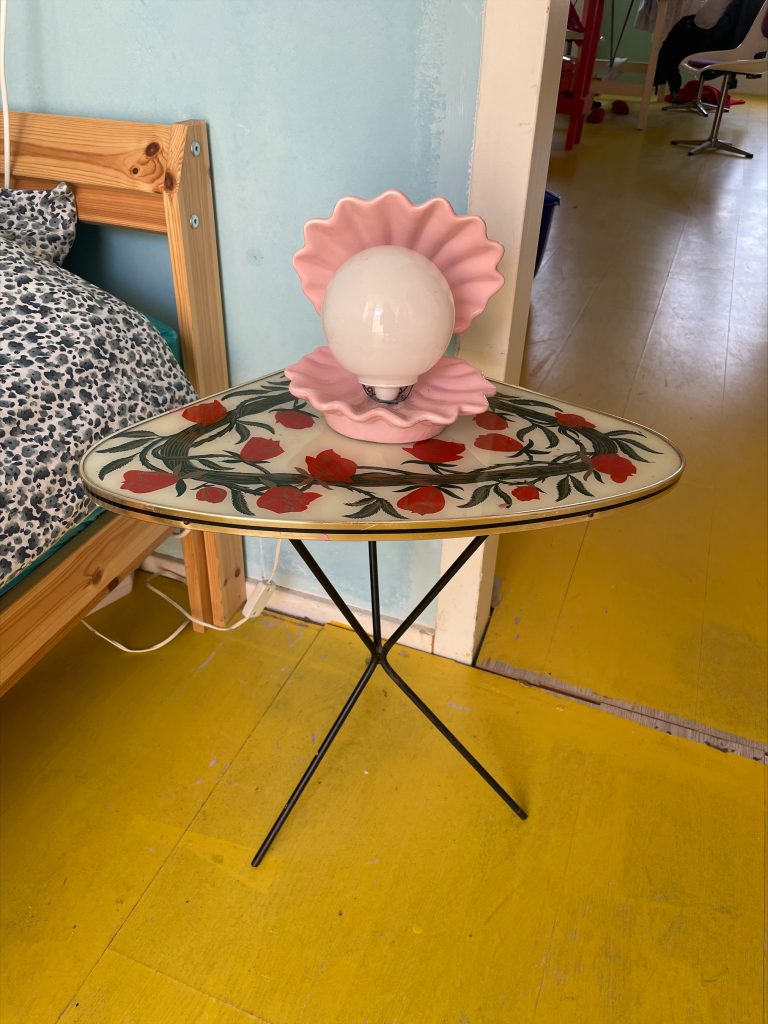 “Ik heb een jaren vijftig tafeltje naast het bed staan. Dat is een van de eerste dingen die als 18-jarige in een tweedehandswinkel kocht toen ik op mezelf gingen wonen in Gent. Het kastje is romantisch: het blad bevat een print met rozen en heeft een gouden rand, en daaronder stalen poten. Daarop staat een lamp in de vorm van een roze schelp. Daarin bevindt zich een parel die licht geeft. De lamp heb ik ooit op een Franse rommelmarkt voor twee euro op de kop getikt. Verder staat er ook vaak een kop thee op.”