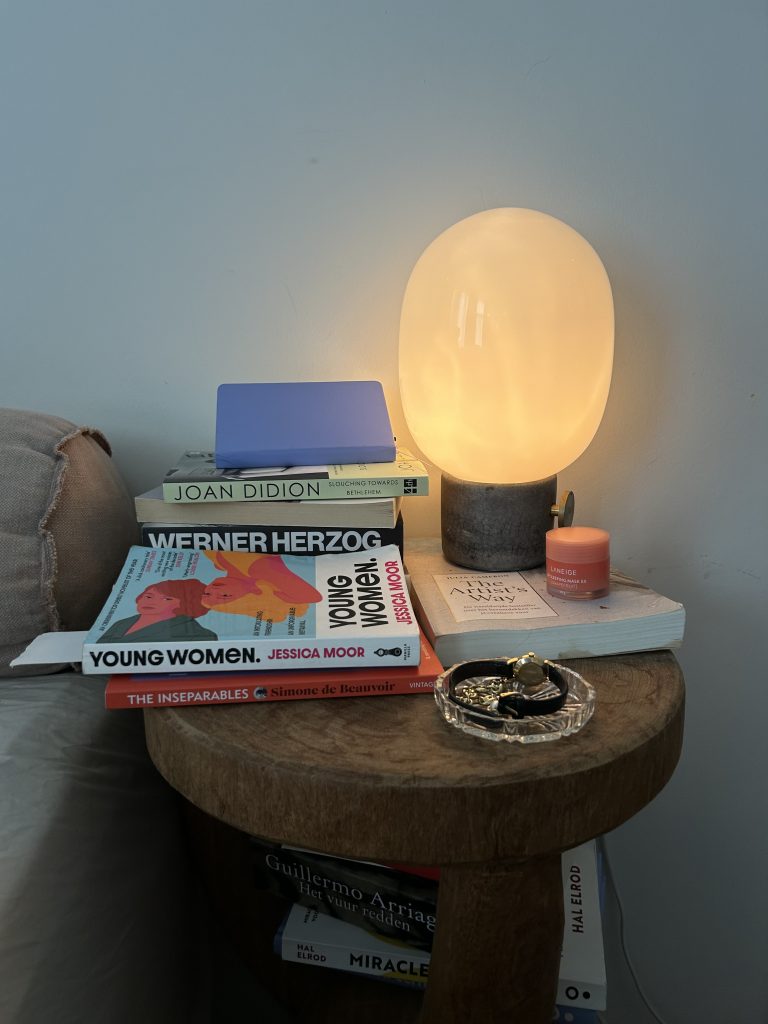 “Een houten blok waar van alles op ligt. Onder andere een paar boeken: op dit moment lees ik A Guide for the Perplexed van filmregisseur Werner Herzog. Een vraag en antwoord over zijn leven en de films die hij gemaakt heeft. Dat lees ik graag in bed. Ook ben ik bezig in Young Women van Jessica Moor. Dat gaat over vriendschappen, ik gebruik het boek als research voor mijn afstudeerscript voor de ScriptAcademy.”