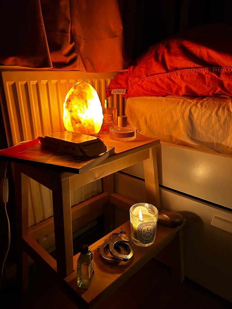“Ik heb een houten trapje, het is niet echt een kastje. Dat trapje dient als nachtkastje. Ik heb werkelijk geen idee waar het vandaan komt, kan best Ikea zijn. Er liggen een hoop spullen op: mijn parfum, een zoutlamp, mijn satisfyer, maar ook een kaars van Diptique (Figuier) waar ik helemaal verslaafd aan ben. Hij geurt echt heel goed. Ook ligt er een set handboeien op, niet dat ik het gebruik, maar het ligt er wel. Verder ben ik aan het lezen in het boek Tarot voor beginners van Esther van Heerebeek. Ik leg kaarten voor mezelf en mijn vrienden, maar ben nog in de leer. Voor het slapengaan lees ik hier vaak in.”