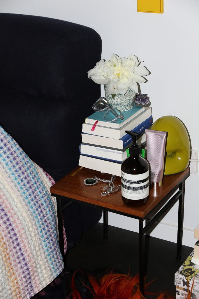 Er ligt standaard een stapel boeken op, op volgorde van: ‘die moeten nog.’ Verder een tube Skin Food van Weleda, voor mijn handen de crème Hinoki van Le Labo en voor mijn triceps – ‘ja, let je op’ – gebruik ik een handbalm van Aesop, Reverence Aromatique. Dat heb ik geleerd van Trinny London, zij vertelde dat je na een bepaalde leeftijd de achterkant van je bovenarmen moet insmeren.