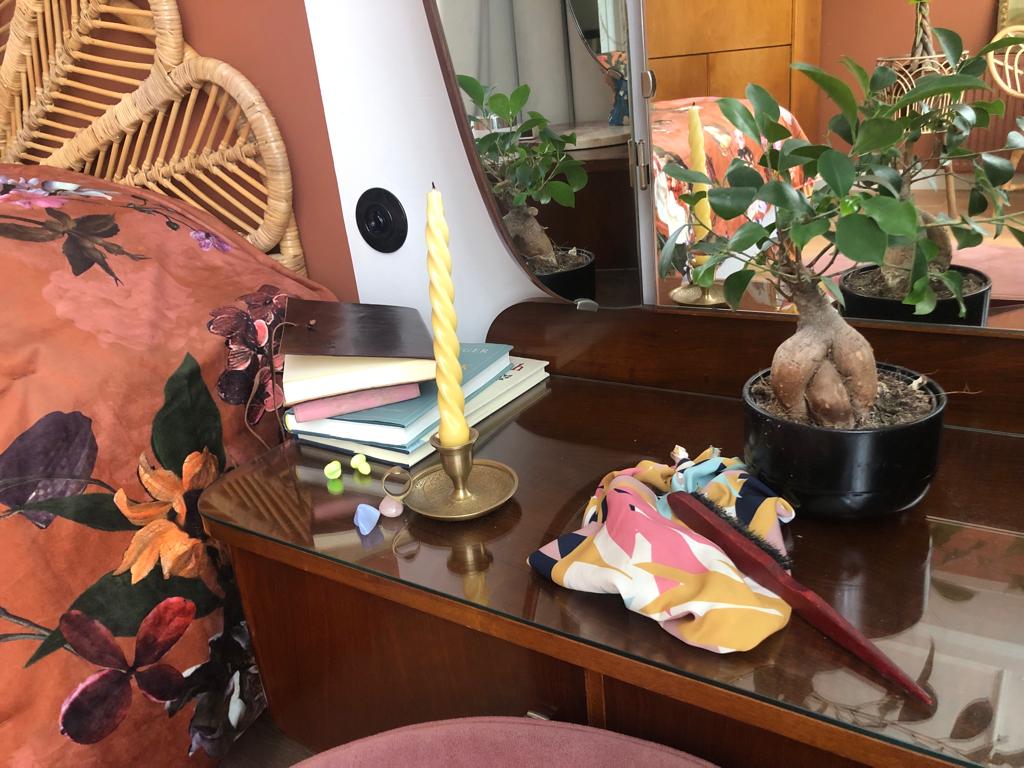 “Het is een vintage kaptafel, die tevens dient als nachtkastje. Dat was mijn grote droom om in huis te hebben. Daarop liggen oordoppen, verschillende stenen die een helende werking hebben (en helpen bij een goede nachtrust), mijn haarborstel en boeken.”