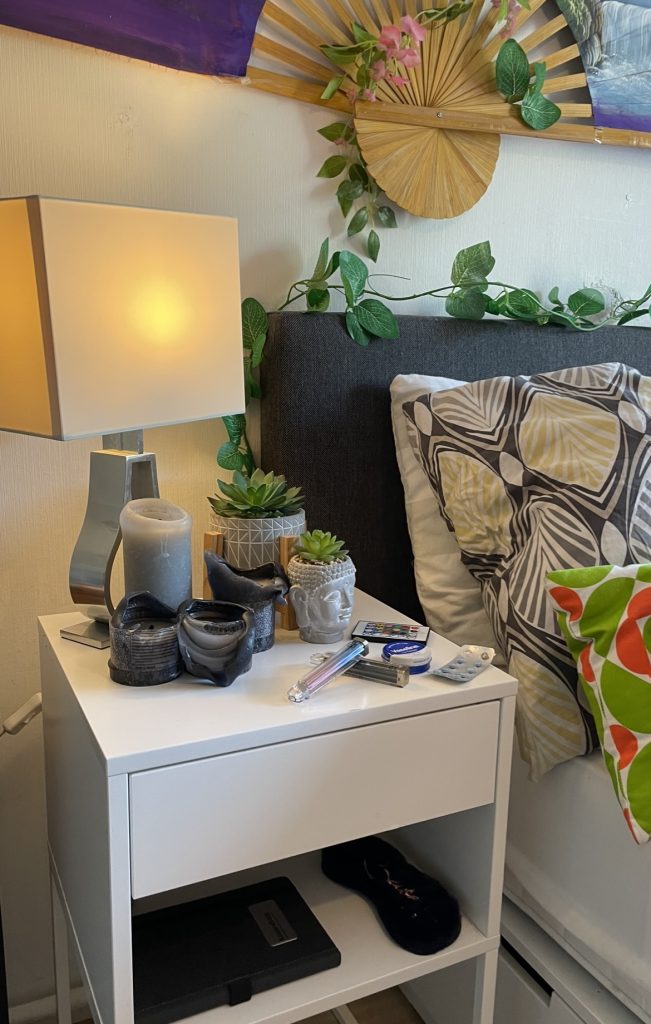“Ik heb mijn nachtkastje overgenomen van de vorige bewoners. Het is gewoon een heel simpel wit houten Ikea-kastje dat bomvol ligt met van alles. Er ligt zelfs zó veel op, dat je hem bijna niet ziet. Ik heb er kaarsen op staan voor een romantische sfeer, een nachtlampje en er ligt lippenbalsem van Labello op, want ik kan echt niet zonder. Verder ligt mijn Vape erop – als ik me verveel hijs ik er een paar keer aan – mijn AirPods en mijn hormoonpillen die ik elke avond moet innemen.”