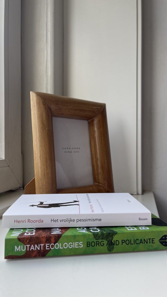“Van de Franse filosoof Henri Roorda het boek Mijn Zelfmoord. Klinkt heel heftig, maar het is een luchtig boek over waarom hij als schrijver zelfmoord wilde plegen. Hij wilde geen schulden afbetalen die hij bij zijn vrienden had gemaakt en zijn huwelijk zat in een sleur. Dus schoot hij zichzelf dood. Ik heb nog ander werk van hem: Het vrolijke pessimisme. Er liggen ook andere boeken op de vensterbank zoals Harry Potter, Melktanden van Emma Curvers en een oud boekenweekgeschenk van Hanna Bervoets. Mijn voornemen is steeds om in bed te lezen, maar dat lukt niet altijd. Ik ben namelijk ook iemand die op Instagram scrolt voor het slapengaan.”