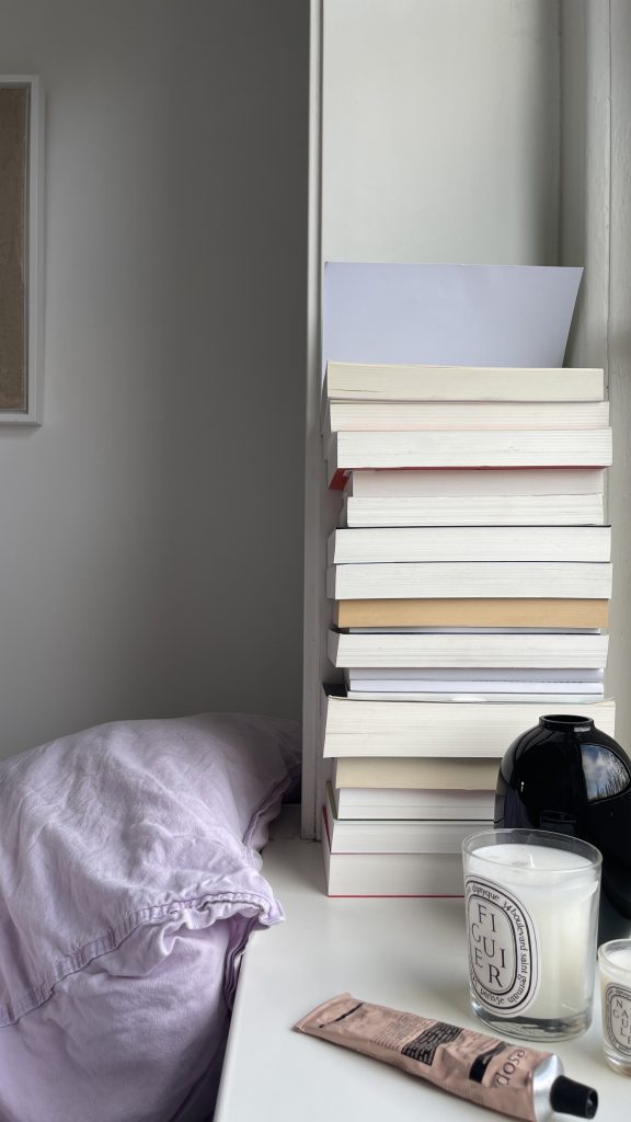 “Geen, ik heb een vensterbank die dient als nachtkastje. Er liggen op dit moment een stapel boeken, een vaasje en soms geurkaarsen van Diptique; onder andere Aubépine, Figuier en Narguilé. Ik heb echt verschrikkelijk veel geurkaarsen in huis. ‘I love the smell of burning money’, zeg ik altijd voor de grap. Verder nog een fotolijstje waar niks inzit. Er staat nog steeds Zara Home en 13 x 15 in en ik woon hier al bijna drie jaar. In het begin was ik voornemens er een mooie foto in te doen, nu vind ik het eigenlijk leuk zoals het is. Ik laat het gewoon zo, er gaat waarschijnlijk nooit iets inkomen. Laten we het erop houden dat het een kunstinstallatie is geworden.”