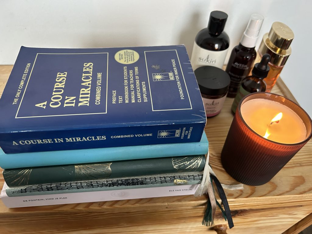 “Eentje van Ikea, hij is van hout en er ligt van alles op. Ik hou niet van rommel, dus hij is wel geordend. Je vindt er altijd mijn dagboeken, notitieboeken en verschillende leesboeken. Op dit moment ben ik bezig in De Fontein van Els van Steijn en A Course in Miracles van Helen Schueman. Een dagboek naast mijn bed vind ik fijn, als ik bepaalde gedachten of ideeën heb, pak ik ‘m erbij.