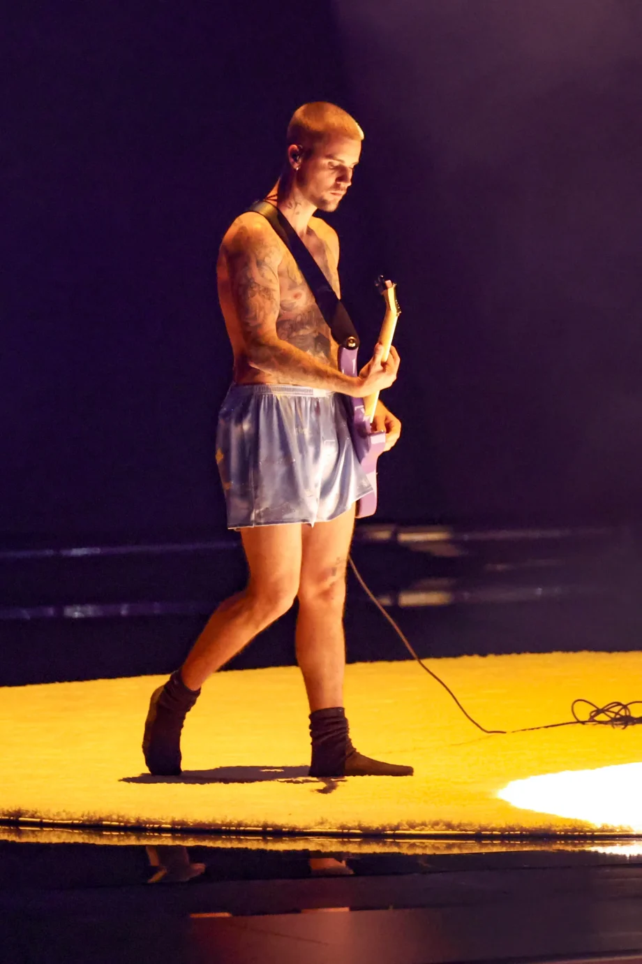 Zondagavond, tijdens de Grammy’s van 2026, maakte Justin Bieber zijn langverwachte terugkeer naar het podium van de awardshow om het nummer Yukon van zijn album Swag uit 2025 ten gehore te brengen. En de Canadese popster maakte zeker een onvergetelijke indruk met zijn akoestische vertolking, gekleed in niets meer dan zijn zijden boxershorts en met een paarse gitaar.