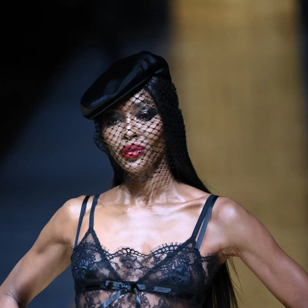 Naomi Campbell in femme fatale-glamourlook op de runway bij Dolce & Gabbana