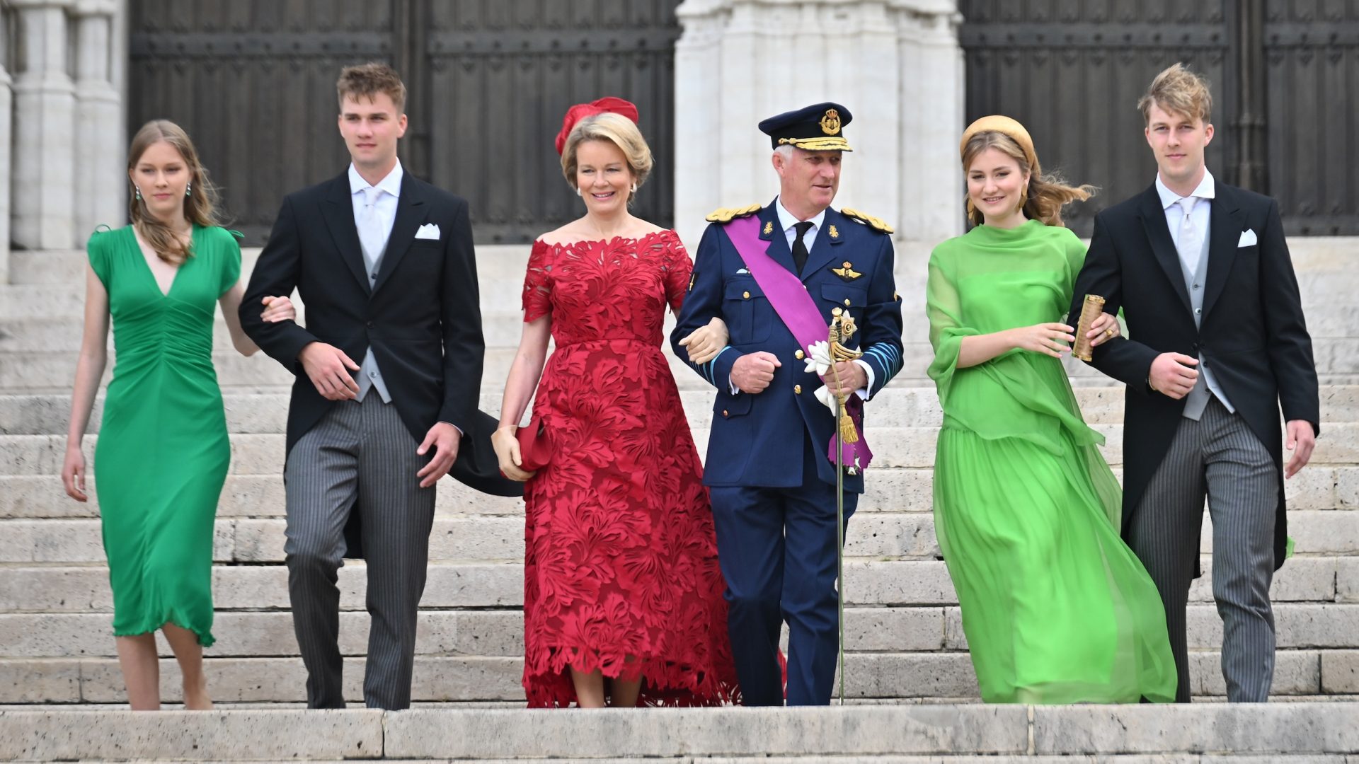 Ook prinses Eléonore draagt een look die we al kennen. Zij verschijnt in een witte maxi-jurk van Temptation Positano, gemaakt van een verfijnde, lichte stof met borduursels en ajourdetails. Ook zij droeg deze jurk tijdens de Nationale Feestdag 2025, niet tijdens het dagprogramma zoals haar zus, maar ’s avonds. Dat de foto niet op die dag is gemaakt, weten we omdat koningin Mathilde een compleet andere outfit draagt. Zij is namelijk te zien in een overhemdjurk van Natan, die ze op 30 april droeg, toen de Belgische pers werd uitgenodigd op het kasteel van Laken.