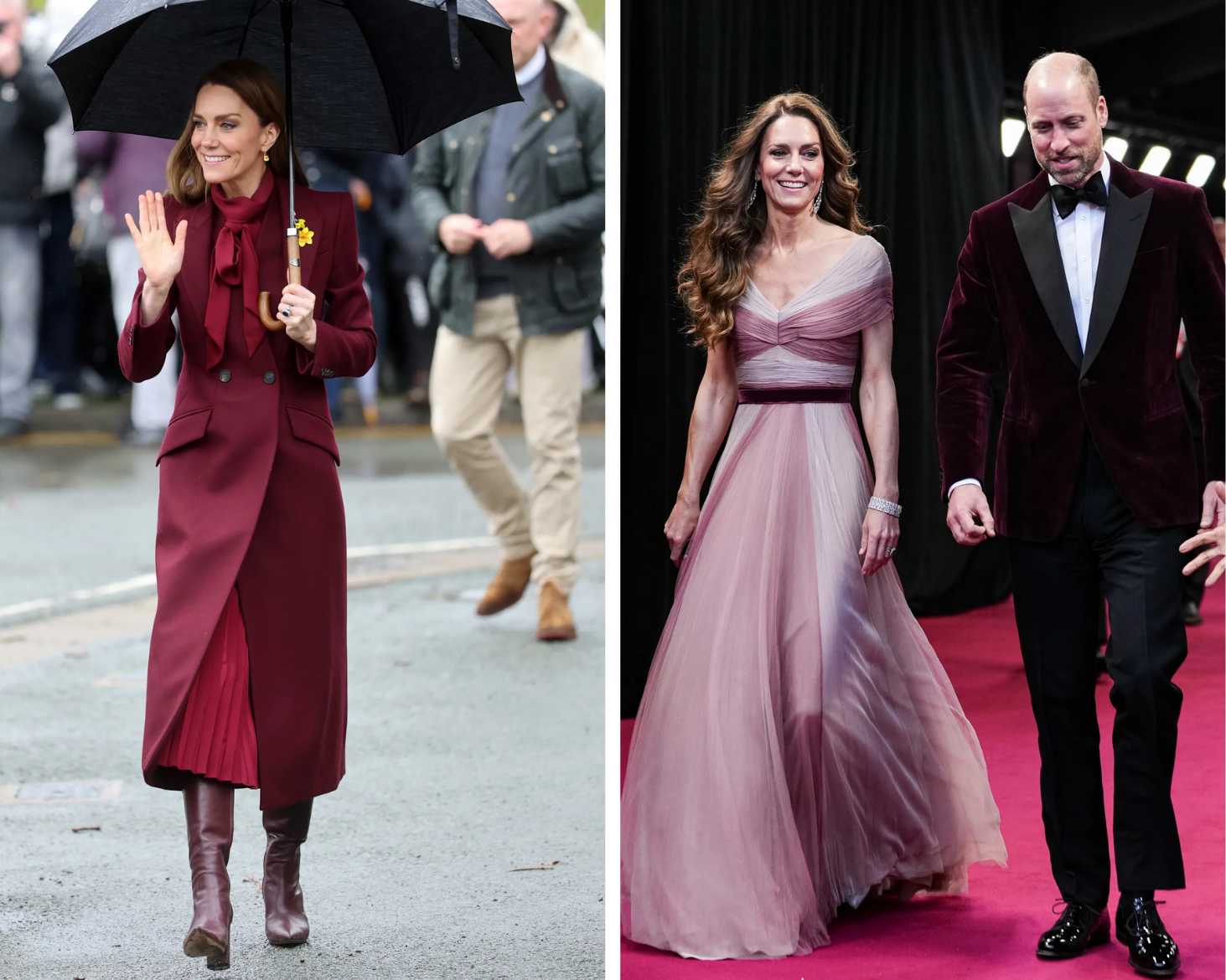 Voor haar toespraak koos Catherine voor een maxi-jurk met plooien en pied-de-poule-motief van Alessandra Rich, met pofmouwen, knopen en een elegante kraag. Ze combineerde de jurk met zwarte suède pumps van Jennifer Chamandi. Ook droeg ze een zwarte suède Bayswater-clutch van Mulberry en sieraden, waaronder Cartier Trinity-oorbellen, een dubbele ketting van Spells of Love en ‘woodland’-bedeltjes van Asprey London. Op haar revers was een narcis gespeld. Dat is de officiële bloem van Wales.