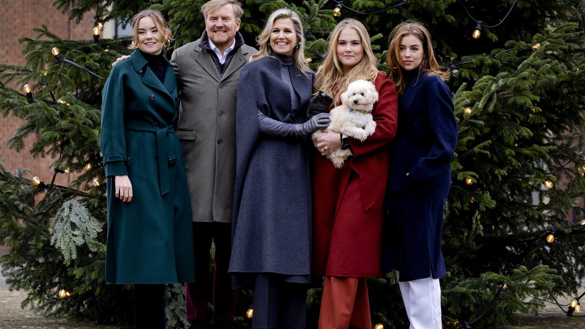 De winterfotosessie van de koninklijke familie is hier. Twee keer per jaar verschijnen de Nederlandse royals voor de camera voor een officiële fotoshoot. Dit keer zijn koning Willem-Alexander, koningin Máxima, de drie prinsessen én hun hondje Mambo volledig in kerstsferen: in een warme manteljas voor de verlichte dennenboom.