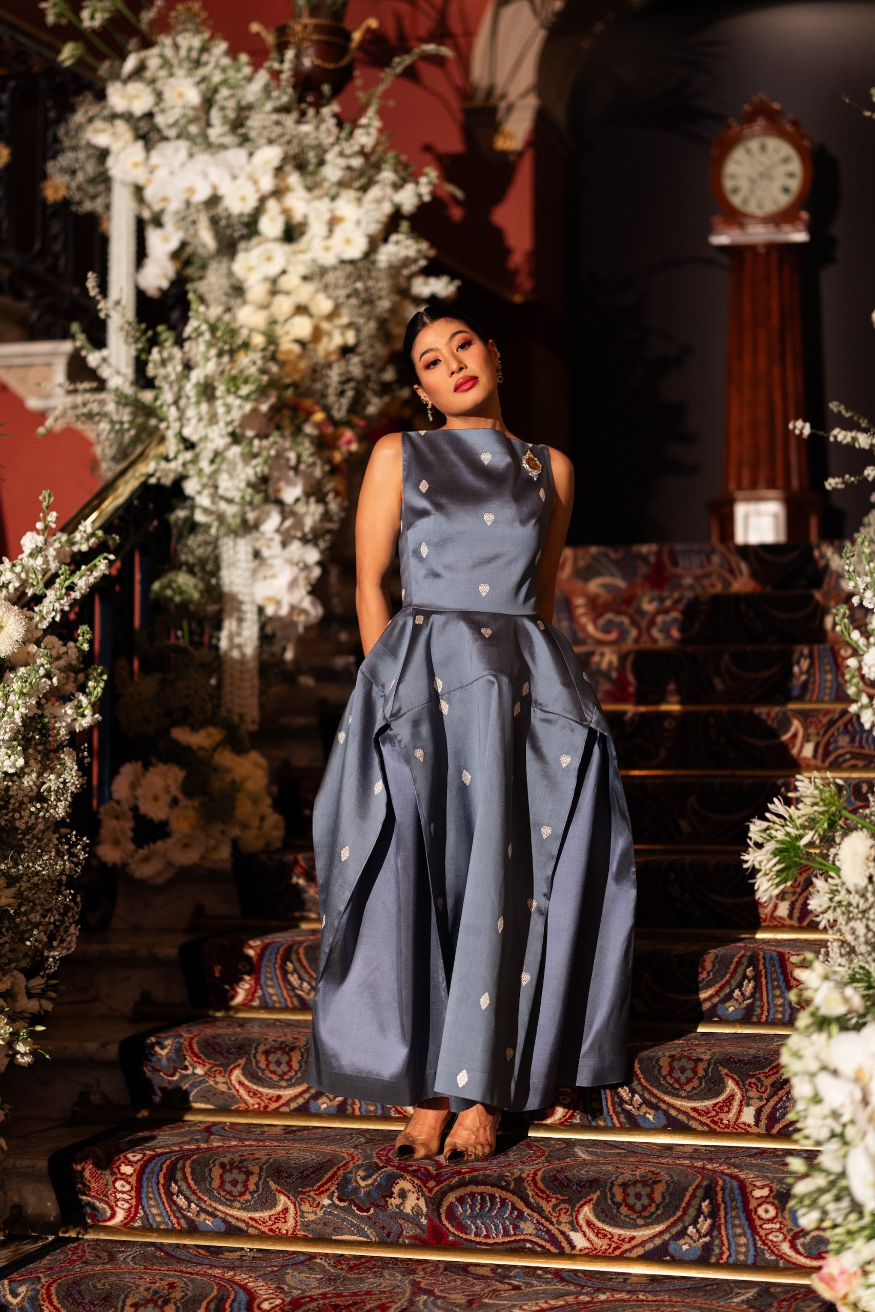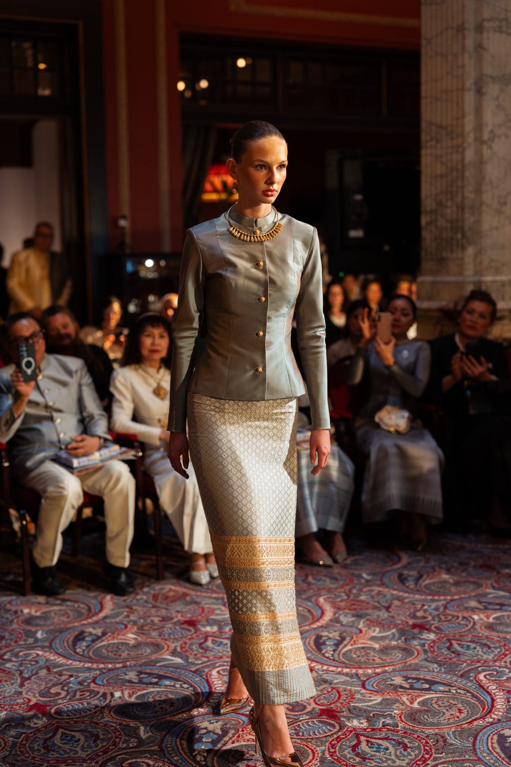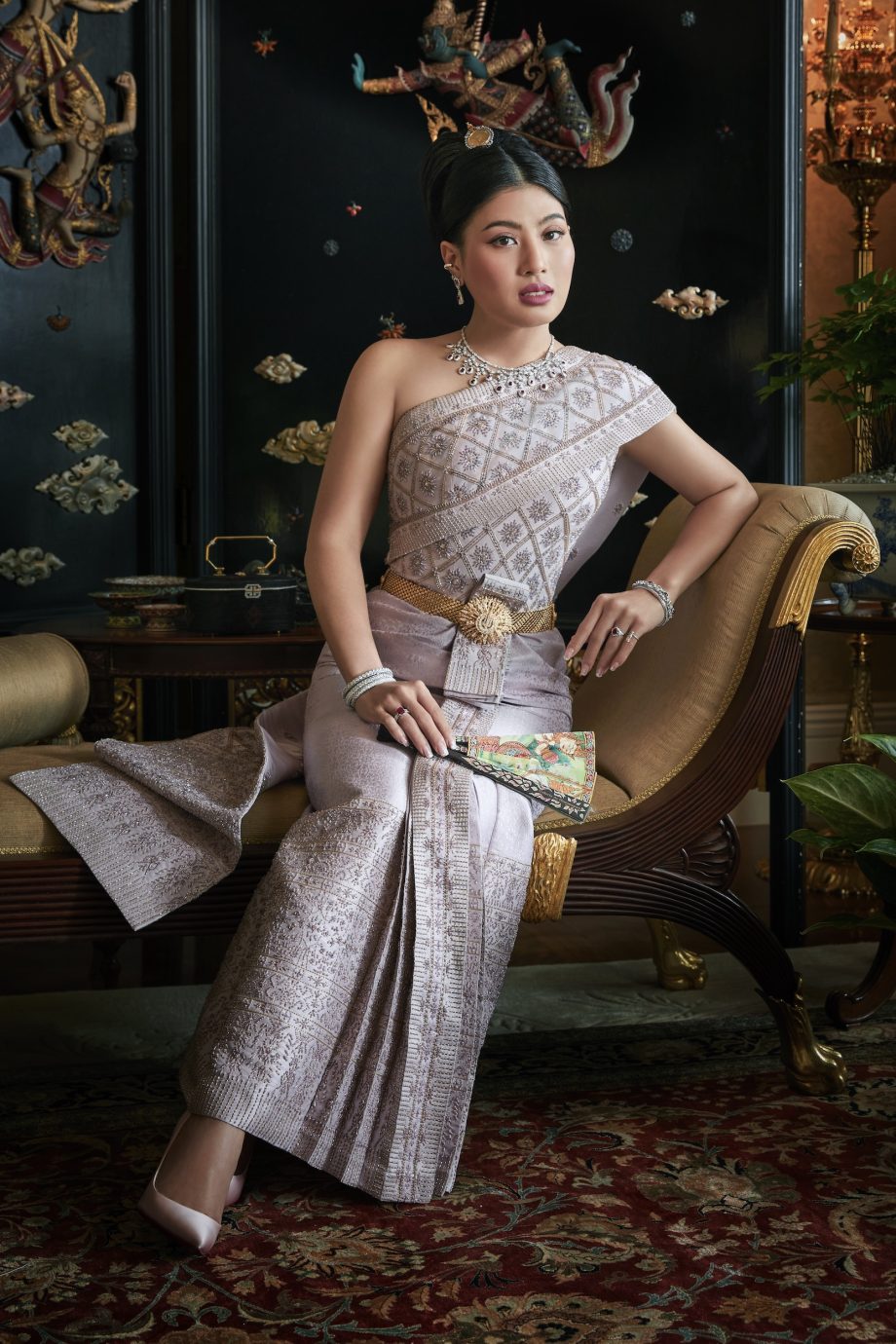 “Binnen Chud Thai bestaat er een duidelijke balans tussen overdag en ’s avonds. Alle acht looks hebben hun eigen functie, gelegenheid en tijdstip”, legt de royal uit. Als voorbeeld neemt ze de Boromphiman, een stijl met een lange kolomrok en een getailleerd, hooggesloten jasje met opstaande kraag. “Dit is voor de avond. Je ziet dat het volledig bedekt is, maar toch accentueert het de taille en het lichaam van een vrouw. Dat is wat ik zo fascinerend vind aan Chud Thai: het is volledig bedekt, maar toch zie je de rondingen. Het verhult de vormen die we niet willen laten zien, terwijl het de vormen benadrukt die we wél willen laten zien. Ik denk dat Chud Thai heel sexy kan zijn, zonder dat het opzichtig is.”