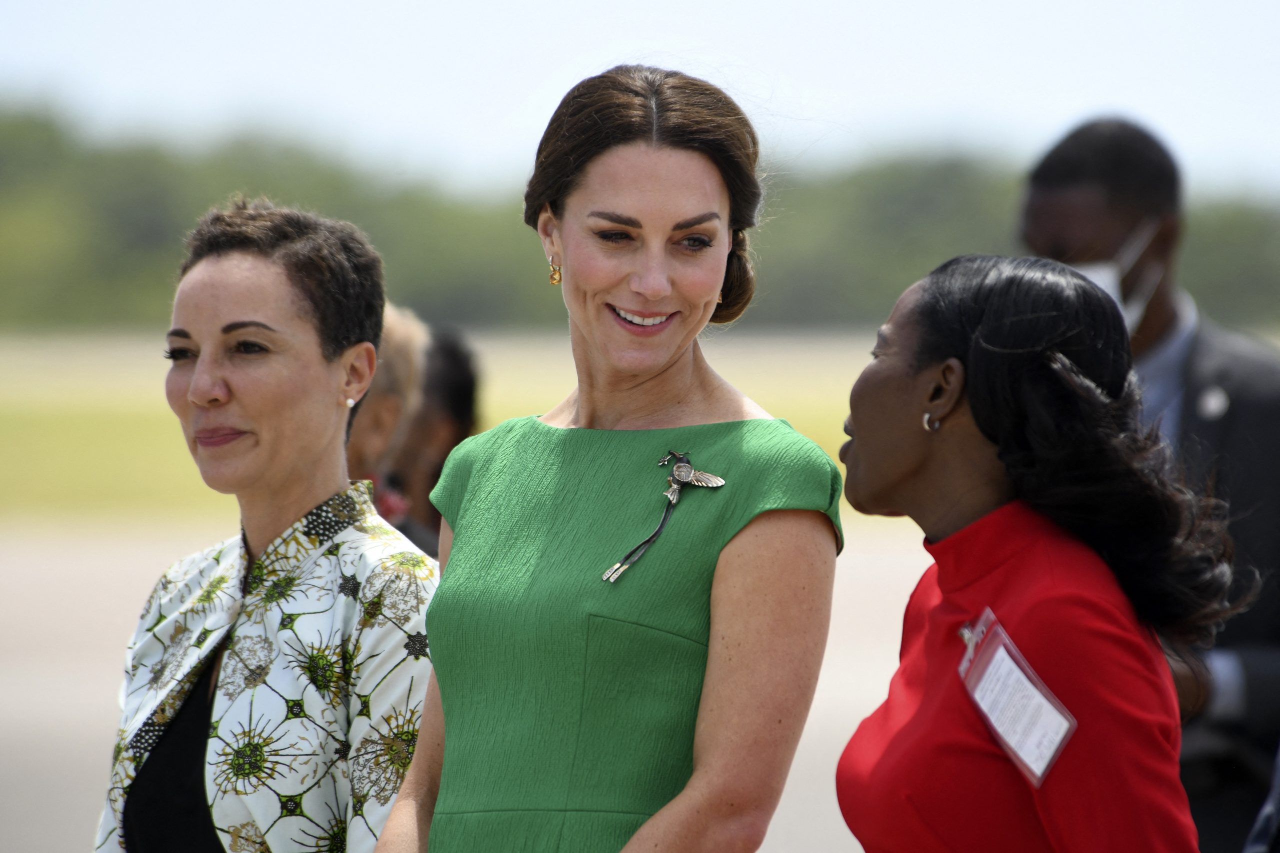 De reis begint in Belize, waar Catherine een zomerse jurk van de Amerikaanse ontwerper Tory Burch draagt, die exact de kleuren van de vlag bevat: blauw, wit en rood. Het zogenoemde flag dressing is iets wat we regelmatig zien bij royals, en wat Kate tijdens deze tour vaker doet.