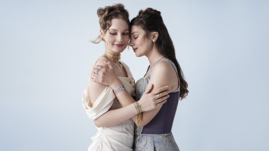 Vanaf het moment dat ik de suite binnenstap waar het interview plaatsvindt, voelt het alsof ik een scène uit Bridgerton binnenwandel. Sierlijk antiek, kroonluchters en bloemen die zó perfect zijn dat ze bijna nep lijken. Maar het zijn vooral Claudia Jessie en Hannah Dodd zelf die de ruimte tot leven brengen. De actrices lachen, kletsen en vullen elkaars zinnen aan alsof ze daadwerkelijk zussen zijn. De chemie die fans herkennen van het scherm, blijkt allesbehalve gespeeld. “We maken elkaar constant aan het lachen”, vertelt Jessie. “En dat sijpelt door in alles wat we samen doen.” Die band is nu ook zichtbaar in hun gezamenlijke Pandora-campagne, waarin verbondenheid en intimiteit centraal staan.