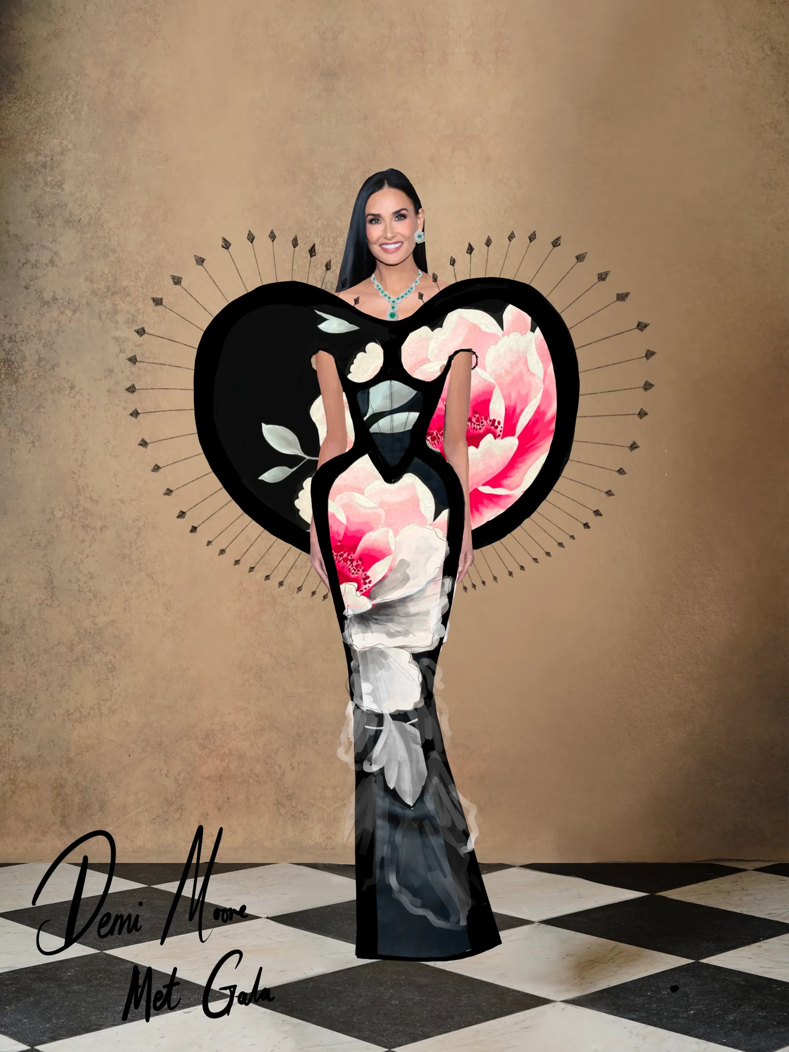 Reed werd vooral geïnspireerd door de doorns in de tuin, vandaar de omtrek van doorns die Moore omringen. “Het was zo belangrijk om deze bijna doornen om haar heen te laten zien, omdat zoveel mooie dingen stekelig aanvoelen.” Ondanks haar regelmatige verschijning front row bij verschillende fashion shows, is Moore slechts vier keer naar het Met Gala geweest.