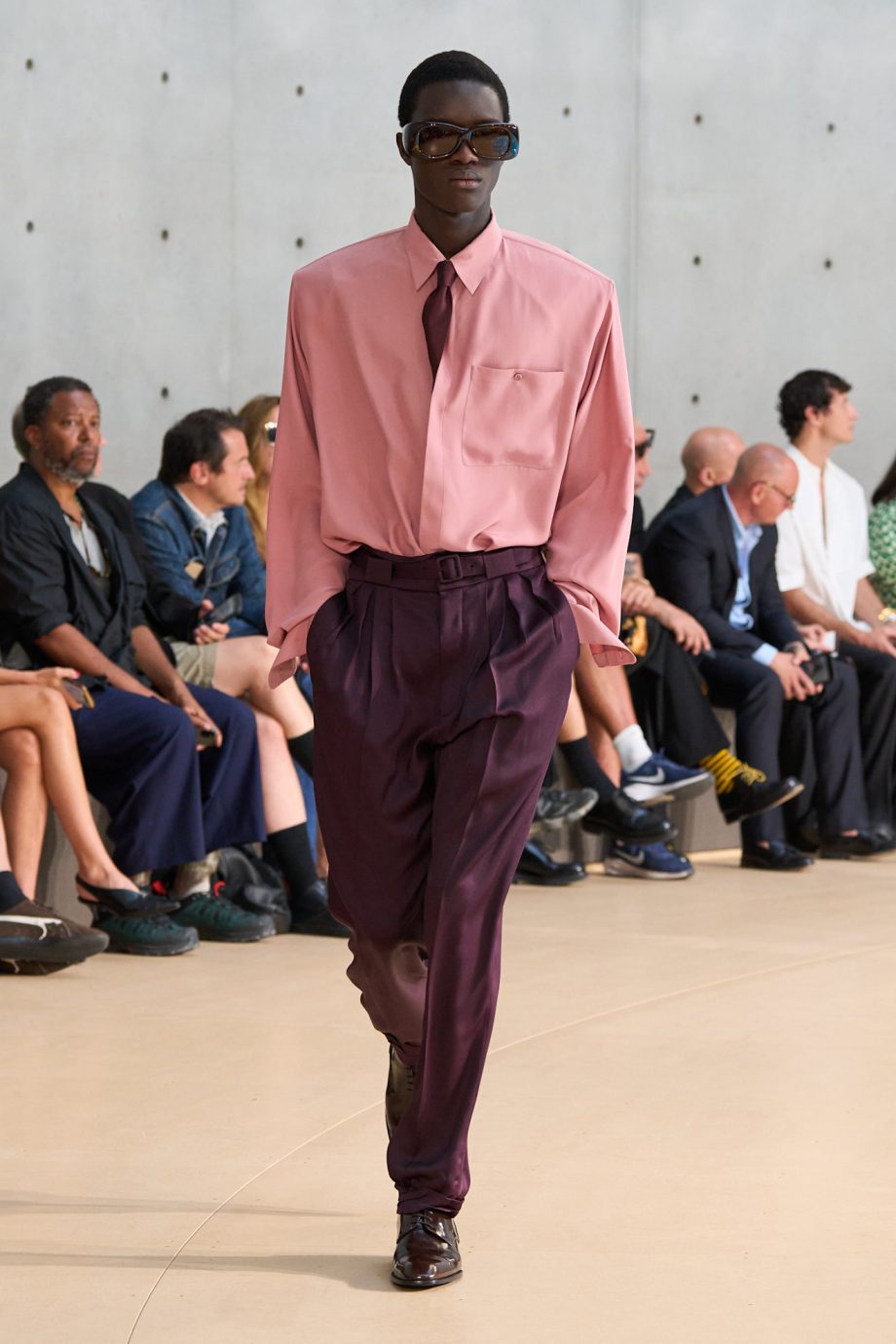 Ook zagen we handige stropdas-stylingtrucs. De stropdassen trokken namelijk flink de aandacht. Ze werden dubbel geknoopt, verkeerd om én met de kraag omhoog gedragen. Daarmee maakte Anderson duidelijk dat de stropdas niet langer alleen het symbool is van kantoor- of zakenmode, maar ook speels en experimenteel kan zijn.