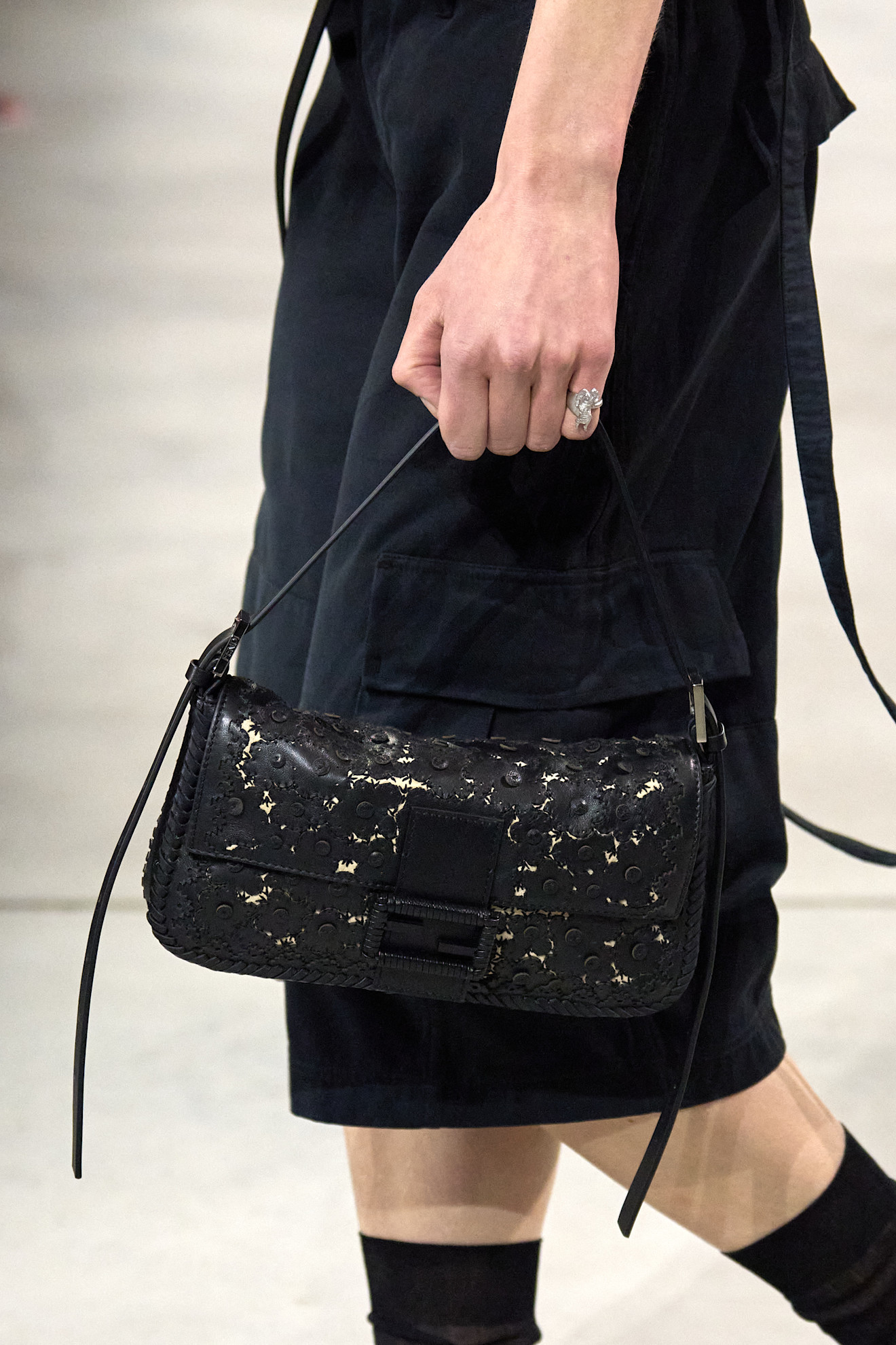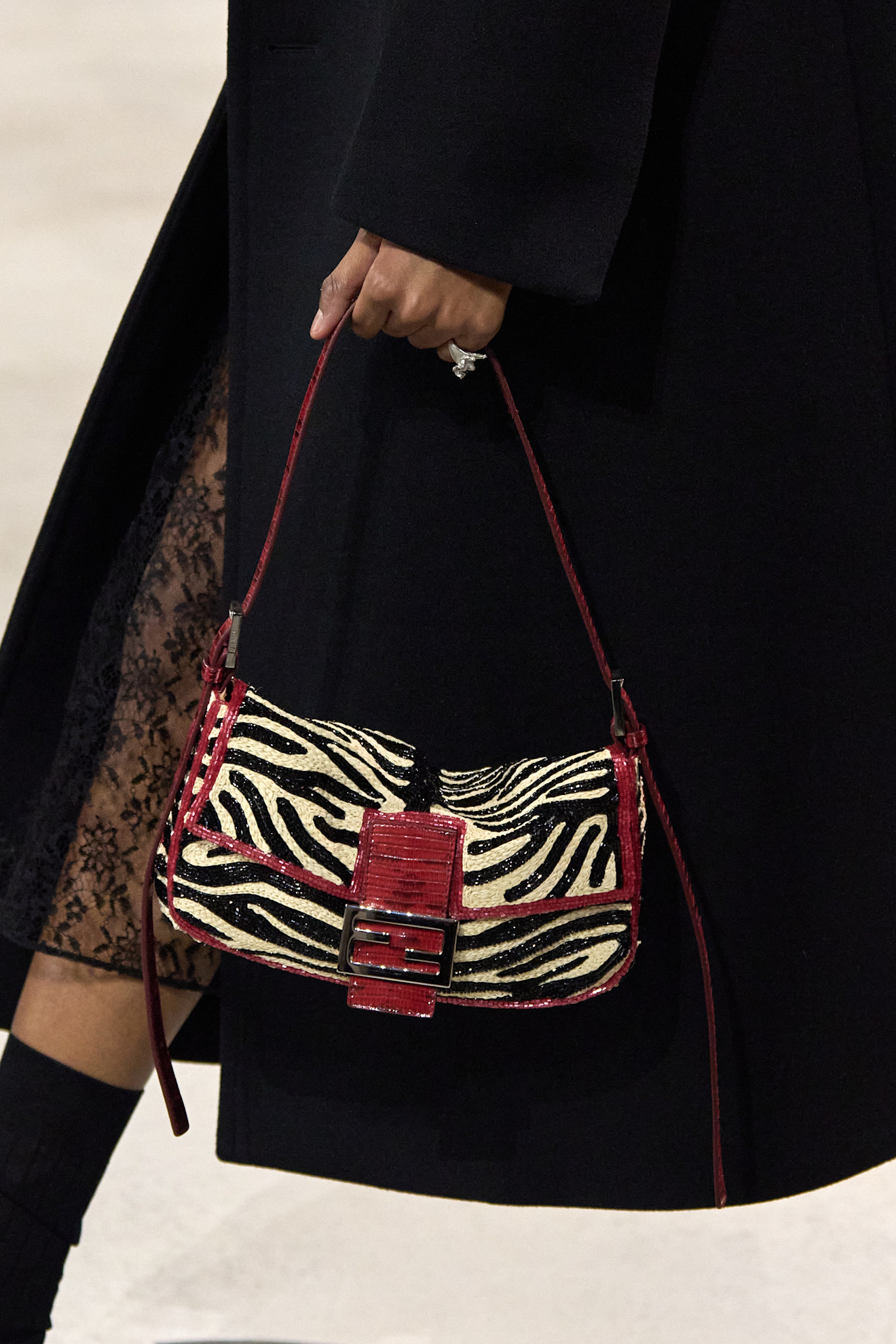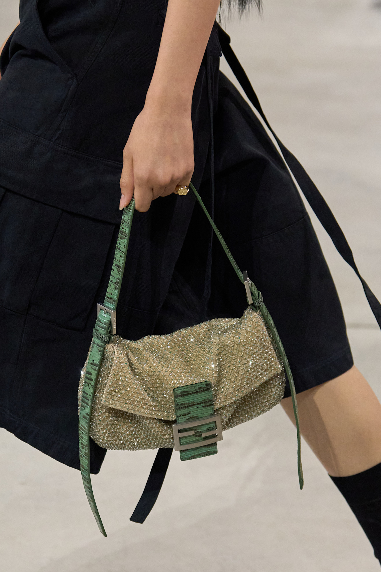 Natuurlijk voerde Chiuri’s kroonjuweel de boventoon: haar Fendi Baguette kwam in allerlei aantrekkelijke uitvoeringen, van minimalistisch zwart tot de kleurrijkste varianten die Carrie Bradshaw laten gillen van blijdschap. Raffia, strass, pailletten, gevlochten leer, kralen… Alles kwam voorbij op de runway – er was zelfs een fluffy variant in snoepkleuren. Daarnaast zagen we ook meerdere versies van de Peekaboo, een ander iconisch ontwerp van het Italiaanse modehuis.
