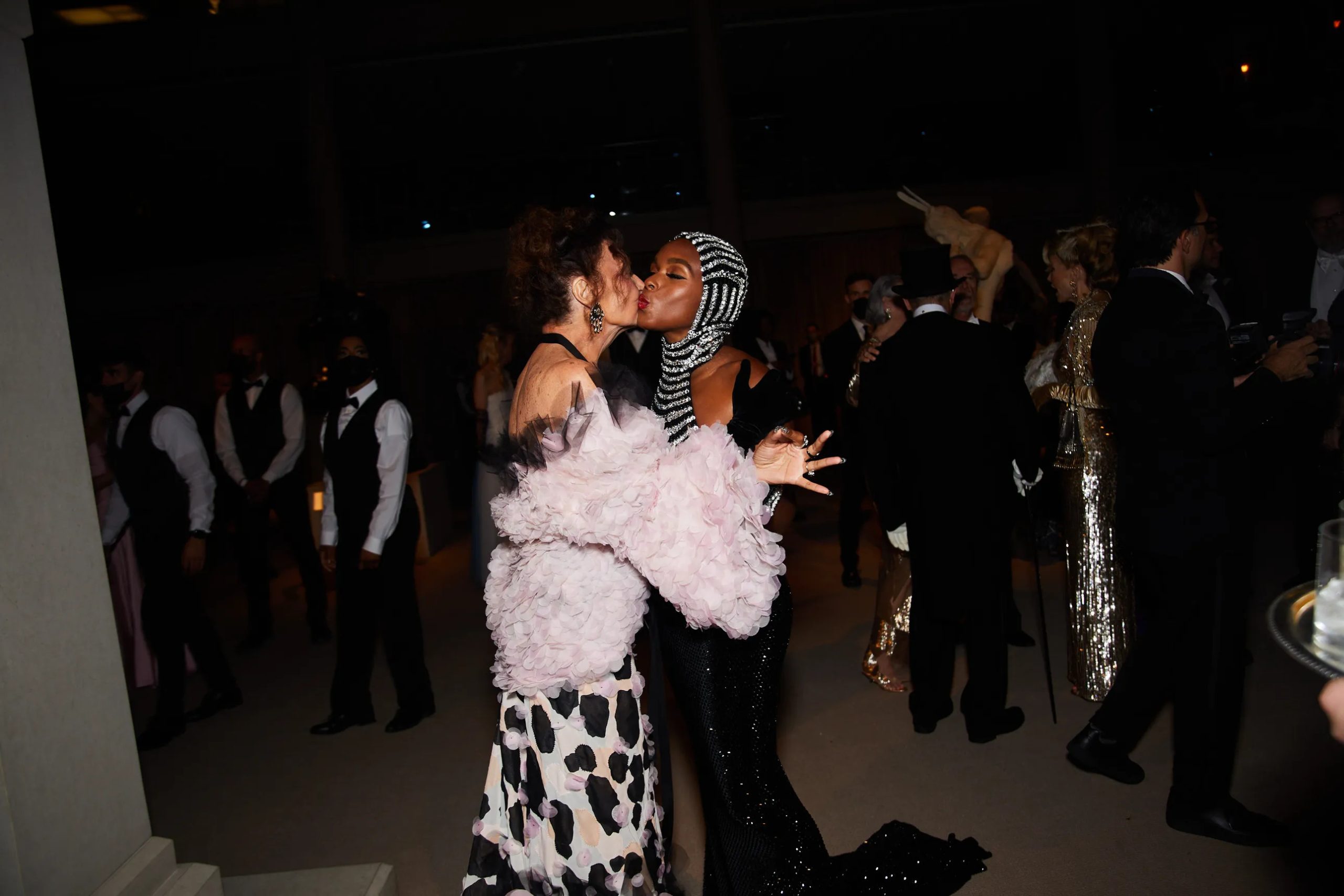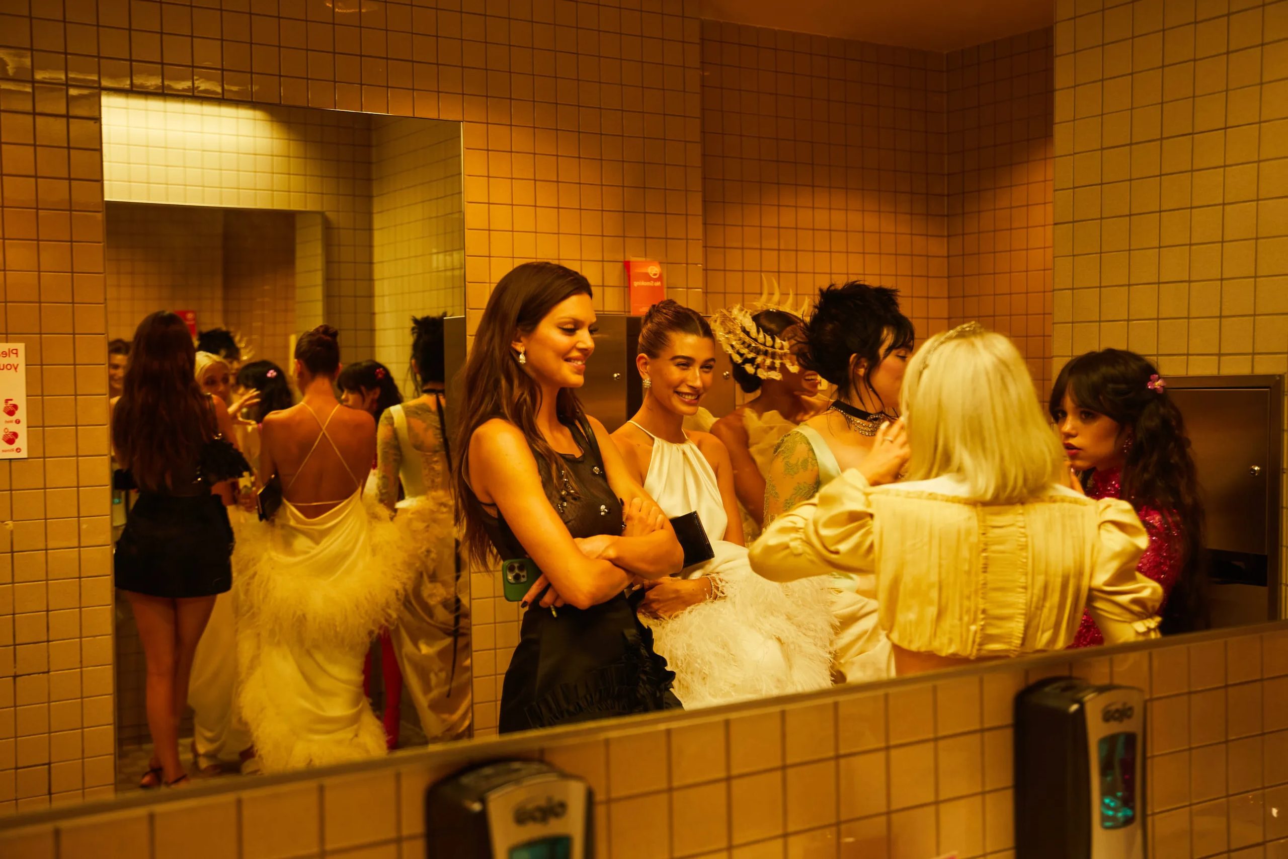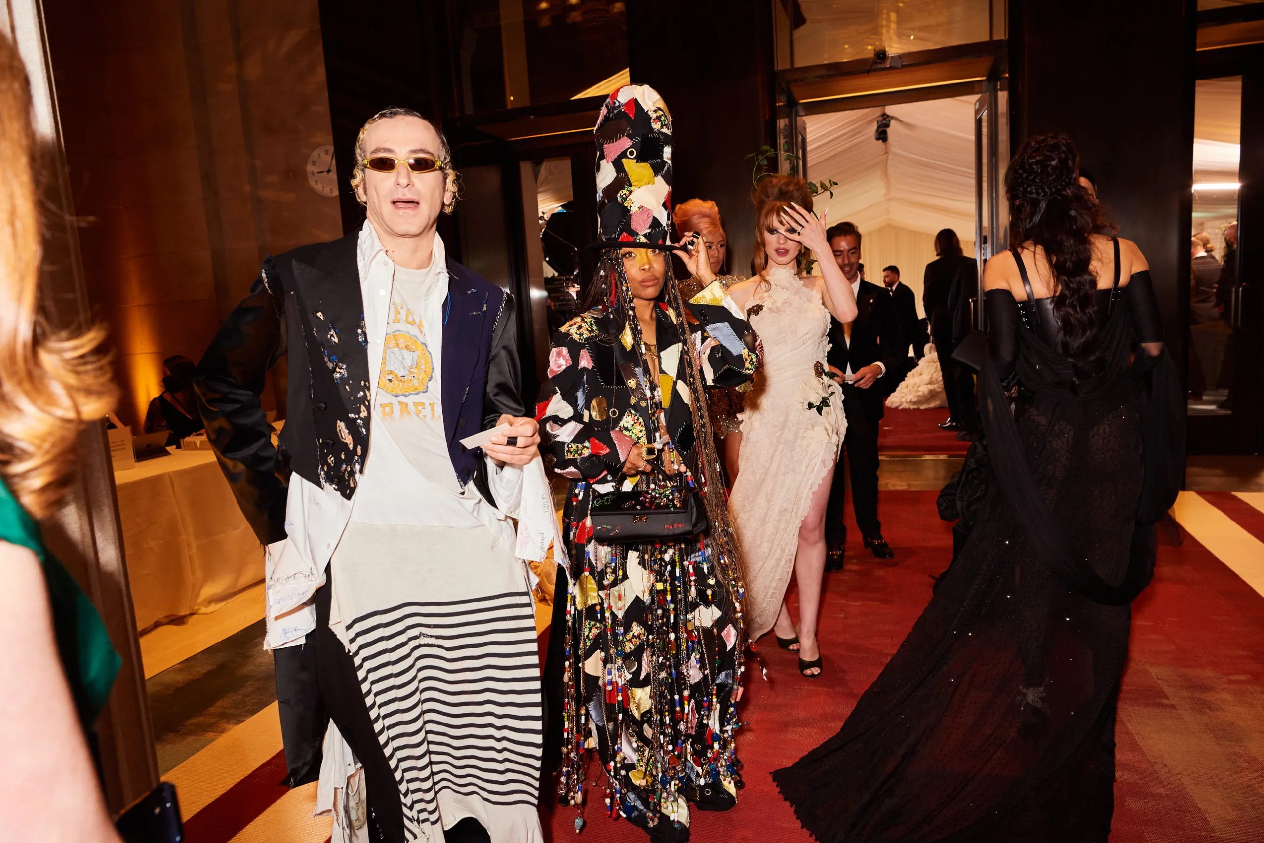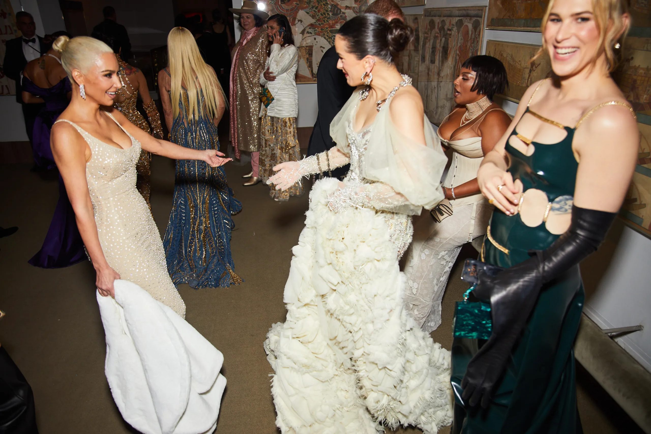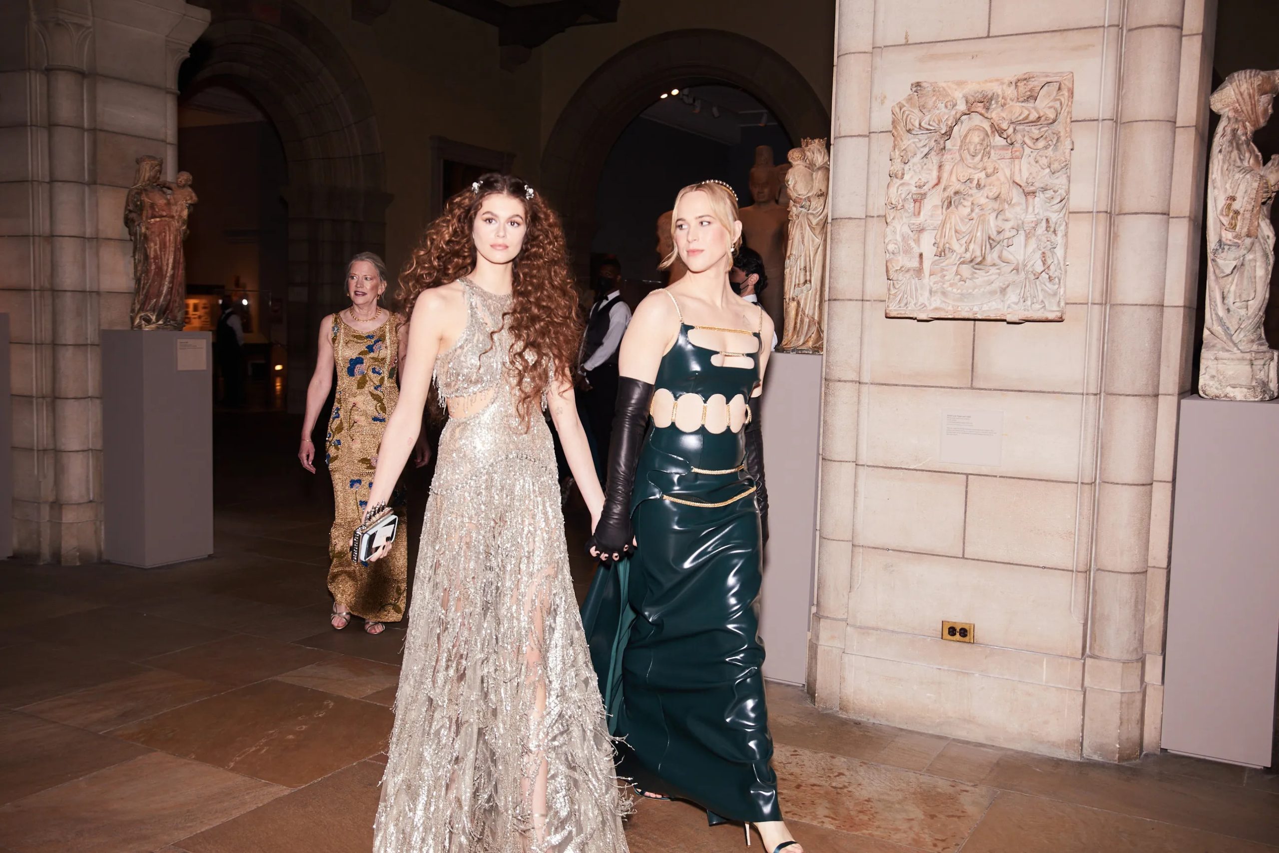 Zo poseert Kim Kardashian met Pete Davidson in de iconische “Happy Birthday Mr. President”-jurk van Marilyn Monroe en houdt Amy Schumer haar zonnebril op tijdens het cocktailuurtje in the Charles Engelhard Court in the American Wing. Gigi Hadid praat bij met vriendinnen Hailey Bieber en Naomi Campbell, Kendall Jenner sleept haar enorme Prada-trein mee en Alton Mason draait vol enthousiasme rondjes met zijn cape door de galerijen van het museum.