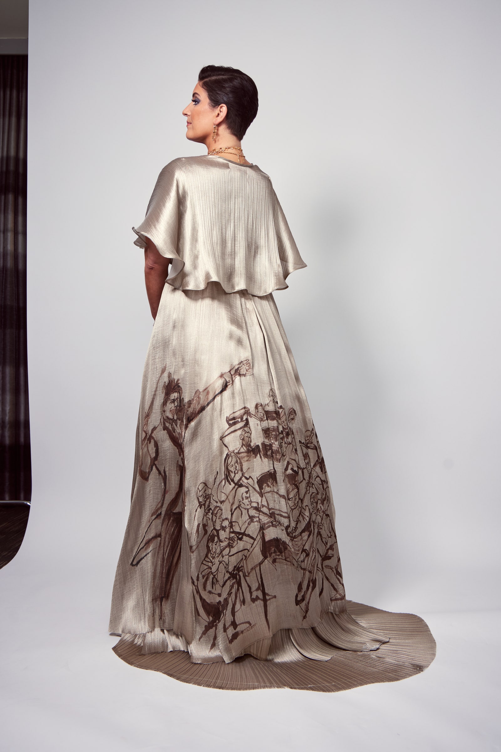Jolie wilde dat de jurk een handgetekende print zou bevatten die de film American Symphony weerspiegelt. Het werd een illustratie van Batiste die een orkest dirigeert. “Ik heb een schildertechniek gebruikt die heel bekend is in Japan. Het heet sumi-e, een oude manier van tekenen, met sumi-inkt”, vertelt Guest. In navolging van Atelier Jolies toewijding aan duurzaamheid, tekende Guest op geüpcyclede, honderd procent zijden stof. “Het was een oefening in wat we konden vinden en gebruiken, om creatief te zijn”, zegt Jolie, die vervolgens met Guest samenwerkte om de stof op een elegante manier op de vorm te draperen. “We legden de panelen uit en bespraken waar ze op haar lichaam zouden vallen. Zoals bij alle projecten binnen het atelier is het doel om kleding persoonlijk te maken en samen gedurfd en creatief te zijn”.