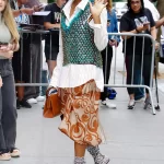 Edebiri, Goldberg en Anderson kwamen uit op een aangepaste versie van een look die voor het eerst te zien was tijdens Loewe’s lente/zomer 2025-mannenshow: een getailleerde blazer van grijs wol met een gedrapeerde broek. “De schoenen waren eigenlijk een herenmodel dat ze voor mij maakten!” zegt Edebiri over haar oxfords. Ze voegt eraan toe dat haar ketting met fazantenveren van bladgoud rechtstreeks van de catwalk kwam. De actrice werd opgemaakt door Dee Carrion: “vrouwelijk maar met scherpe lijnen”. Nagelstylist Eri Ishizu creërde nagels met vergulde accenten. Nog een knipoog naar Roberts: ze toonde een nieuw rood kapsel, gekleurd door Jacob Aaron Dillion.