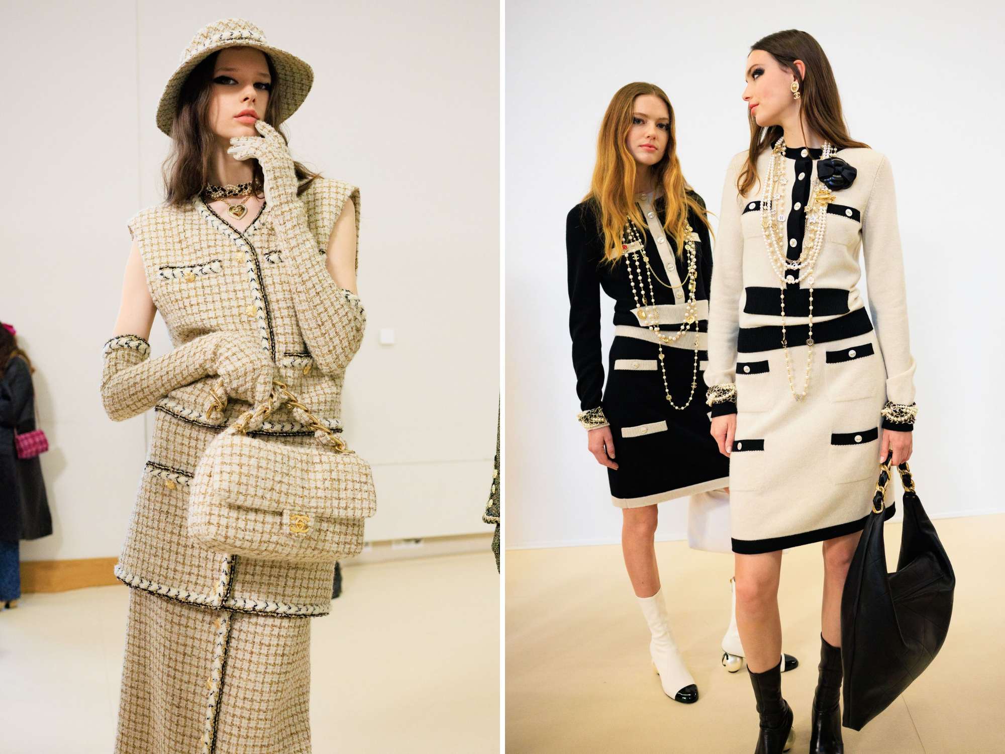 Seizoen na seizoen blijft Chanel trouw aan zijn kenmerkende stijlcodes, terwijl het tegelijkertijd vernieuwing omarmt. In deze collectie stonden de strik, de parel, de klassieke zwart-wit combinatie en de iconische juwelenknop centraal. Strikken, die niet alleen op de uitnodigingen en in het decor te zien waren, verschenen ook in de ontwerpen zelf – op kragen, manchetten, gebreide truien en zelfs op laarzen.