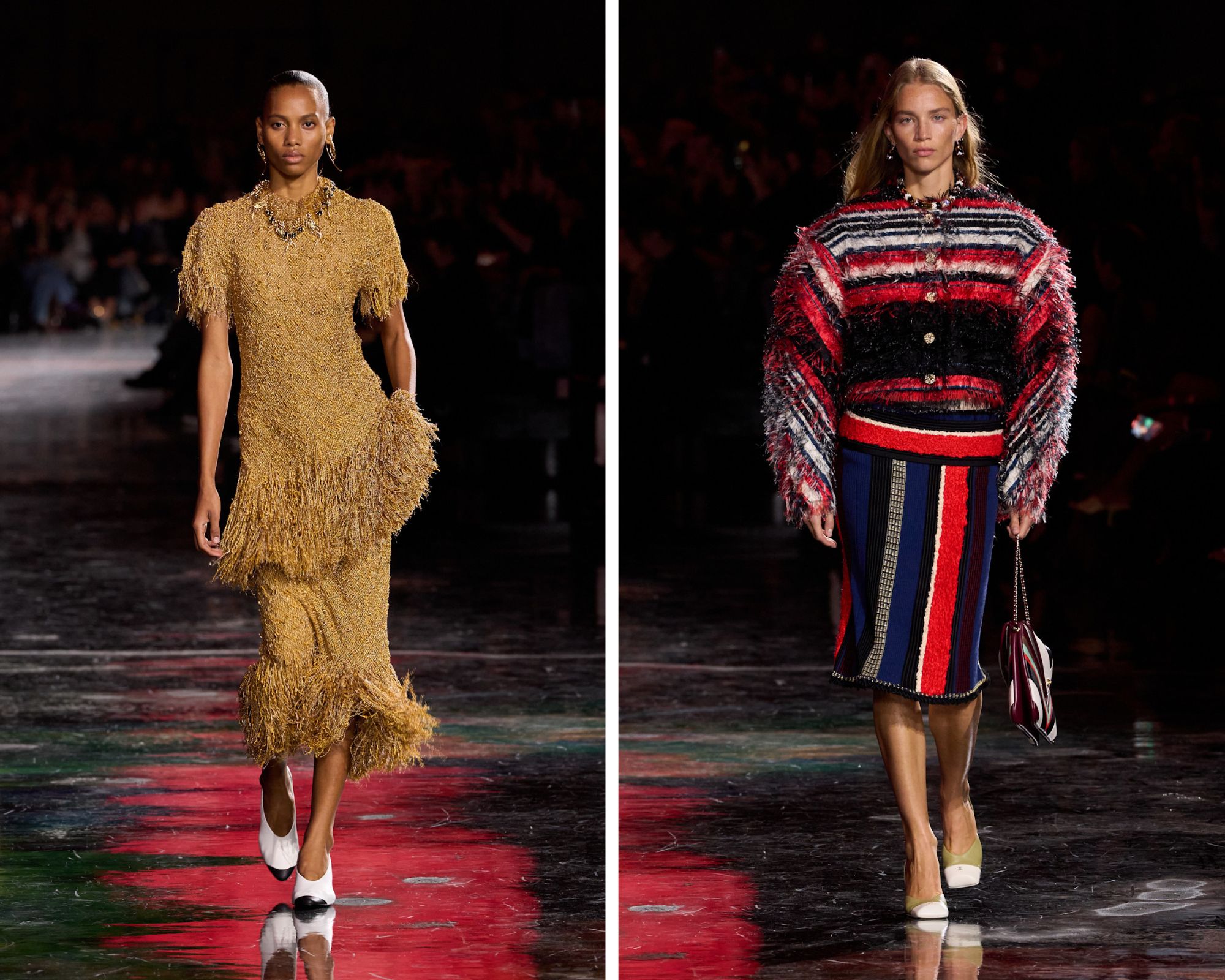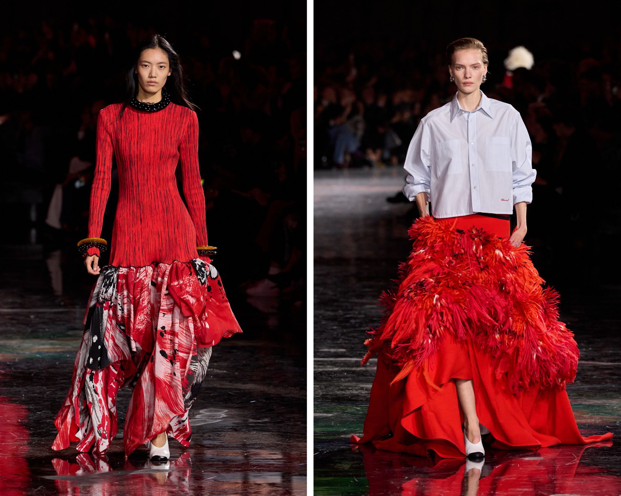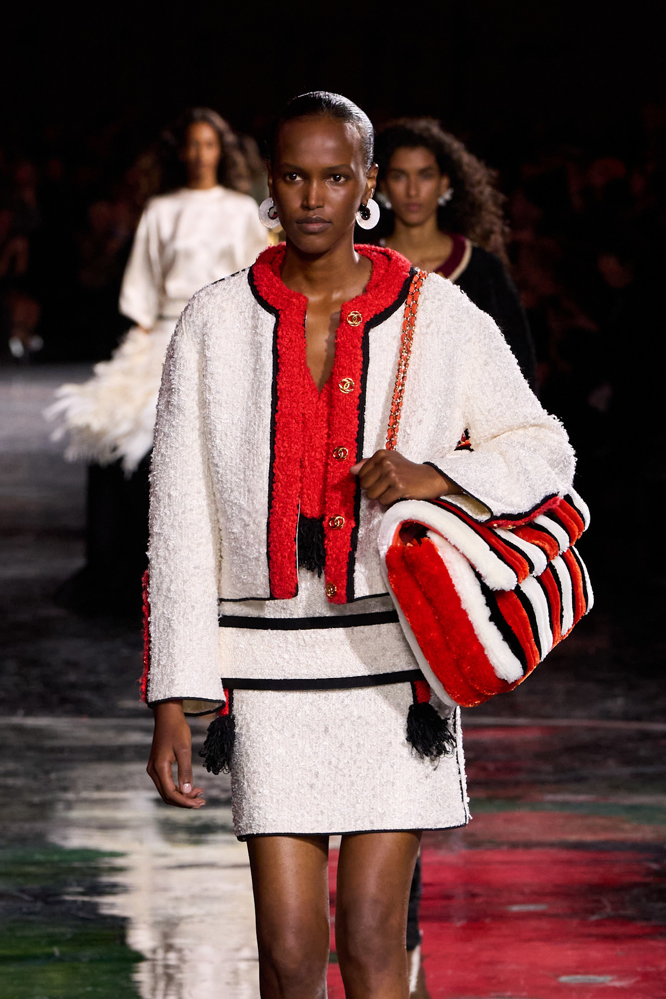 Na het zien van de eerste look – een eerbetoon aan Gabrielle Chanels kenmerkende mannelijke silhouet geïnspireerd door haar grote liefde Boy Chapel: een kort blazerjasje, een simpel overhemd en een grijze pantalon – werd meteen duidelijk dat een nieuw Chanel-tijdperk is aangebroken. Blazy herinterpreteerde de signatures van het modehuis op sublieme wijze. Denk bijvoorbeeld aan de camelia-bloem die terugkwam in de accessoires (grote broches en statementkettingen) en de kleding (in de zomen van two-pieces en de felle kleur rood die we steeds zagen). Of de vele parelkettingen, gedragen op de meest extravagante manier mogelijk en – opvallend genoeg – vrij van uitvergrote logo’s.