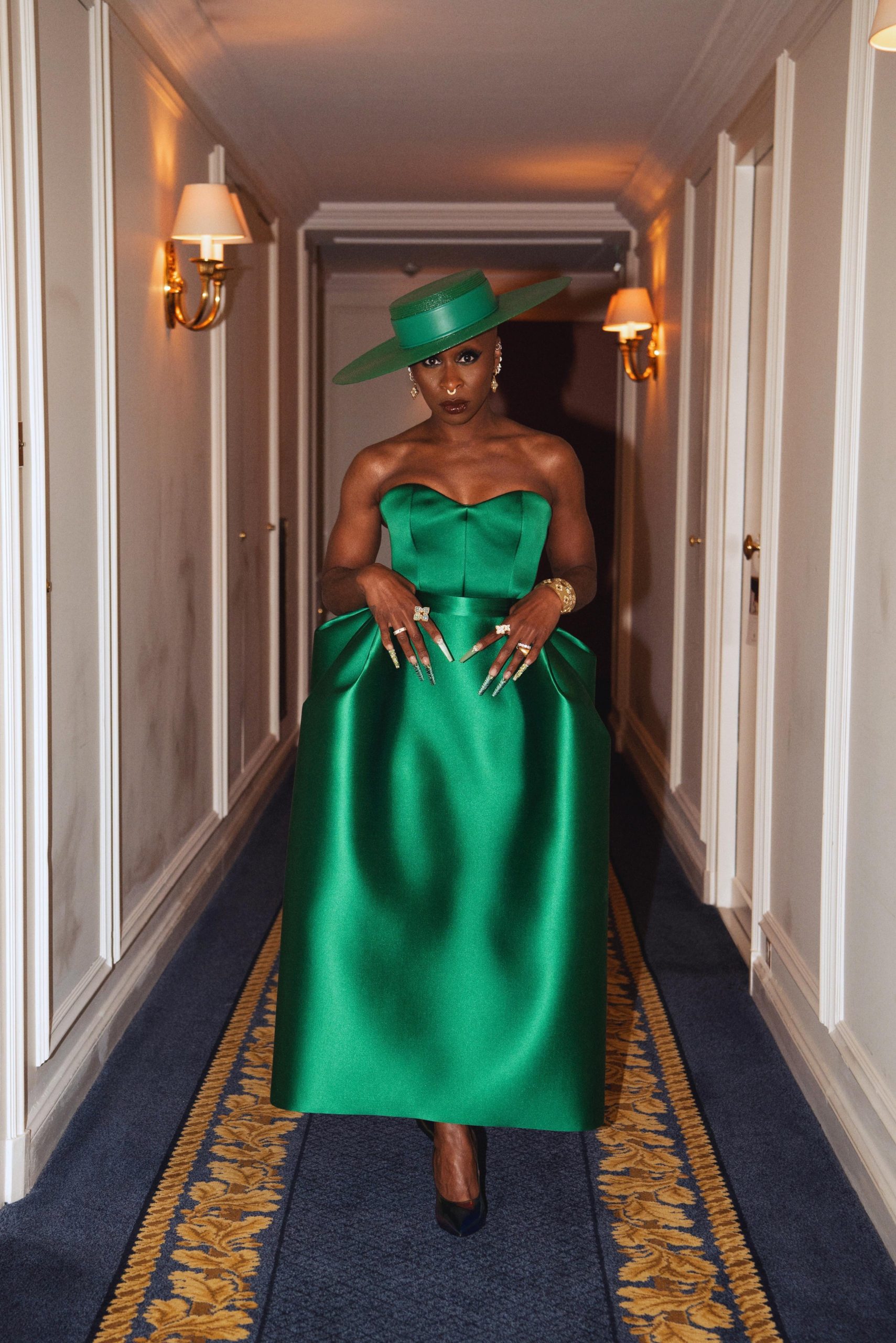 Wie had Erivo’s op Elphaba geïnspireerde look ontworpen? Het was een op maat gemaakt Louis Vuitton-ensemble in – hoe kan het ook anders – smaragdgroen. “Bij het zoeken naar referenties werden we geïnspireerd door Dominique Deveraux uit Dynasty”, zegt Erivo, die werd gestyled door Jason Bolden. “Haar edge, haar verfijning, haar elegante Parijse stijl. Het was ook heerlijk om de referentie van een mooie, sterke zwarte vrouw te gebruiken.”