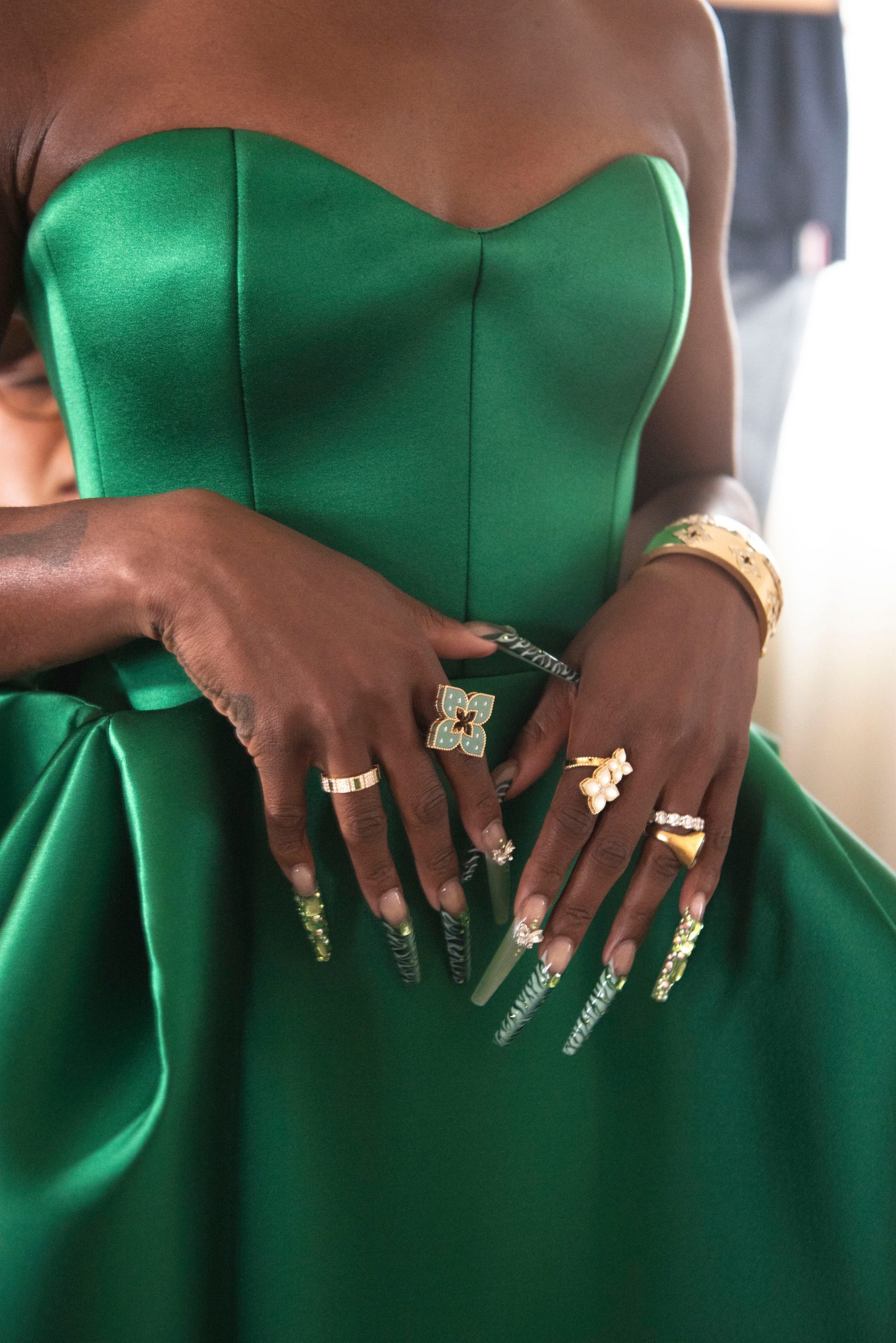 Cynthia’s favoriete details waren de accessoires, waaronder haar juwelen van Roberto Coin en een hoed met een dramatische rand. “Toen we de laatste Louis Vuitton-show bijwoonden, zagen we de hoeden heen en weer gaan op de catwalk, en we besloten om iets toe te voegen dat een beetje persoonlijker was voor mij, wat in dit geval de hoed is”, zegt Erivo. “Ik vind hem geweldig! De vorm en structuur van de jurk geven een throwback naar de klassieke Parijse stijl, wat toepasselijk voelde gezien waar we zijn. Dat is ook iets waar ik van houd!”