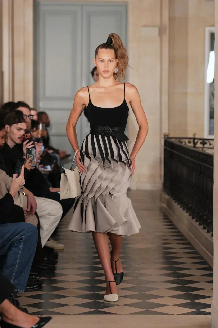 De verschillende teasers die de afgelopen dagen op social media verschenen, net als de uitnodiging voor de show zelf (een XL-kam, hot-stamped met Le Palmier), lieten weinig aan de verbeelding over. Bij Jacquemus maakt het palmboomkapsel dit seizoen een uitgesproken comeback. Denk aan een ultrahoge paardenstaart, hoog op de kruin vastgezet, met getoupeerde of zelfs gekrulde punten die in een waaier langs het hoofd vallen.