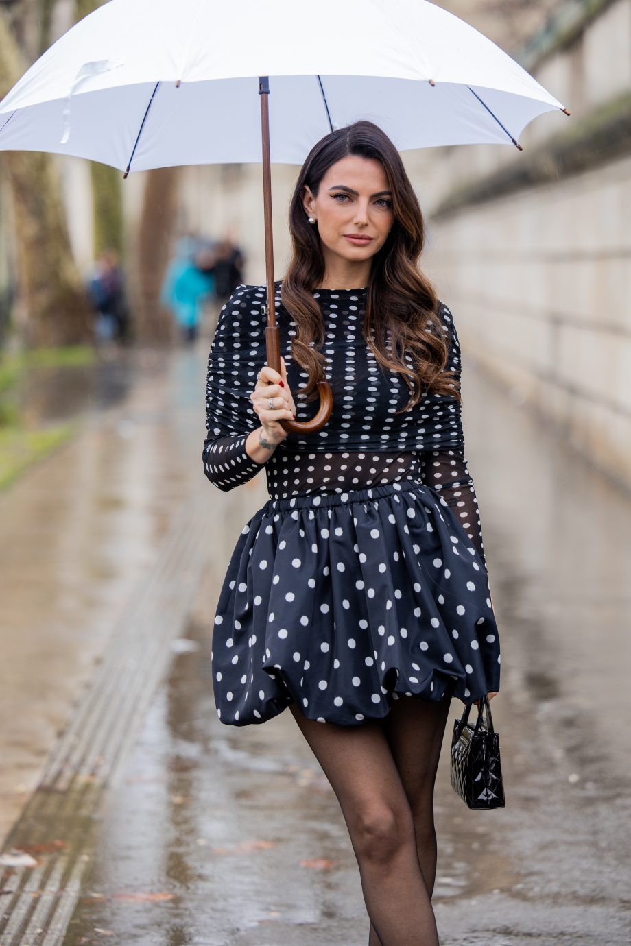 De regen stoorde Kelly Piquet niet tijdens haar bezoek aan Patou bij Paris Fashion Week. Met een witte paraplu arriveerde ze bij de show. In een outfit vol polkadots liet Kelly Piquet zien dat deze grote zomertrend ook in 2026 nog altijd relevant is. En zij niet alleen: polkadots waren dit seizoen opvallend vaak te zien in Milaan en Parijs.