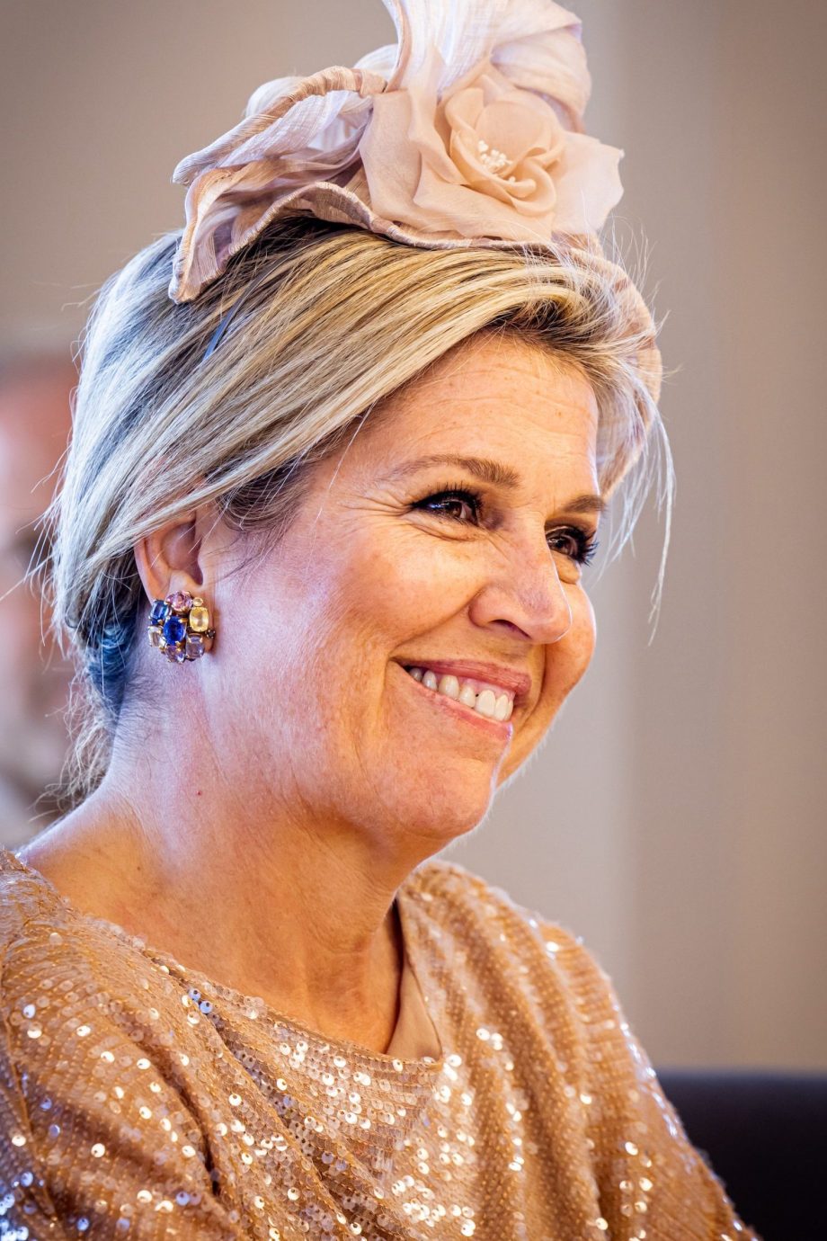 Bezaaid met fonkelende pailletten kreeg de outfit bijna een disco-achtige eighties look – maar dan koninklijk. Die royal-twist zit ‘m vooral in haar poederroze bloemenhoed, een ontwerp van Maison Fabienne Delvigne. De roze hakken zijn van Máxima’s favoriete go to-schoenenmerk Gianvito Rossi, en haar clutch is van Sophie Habsburg.