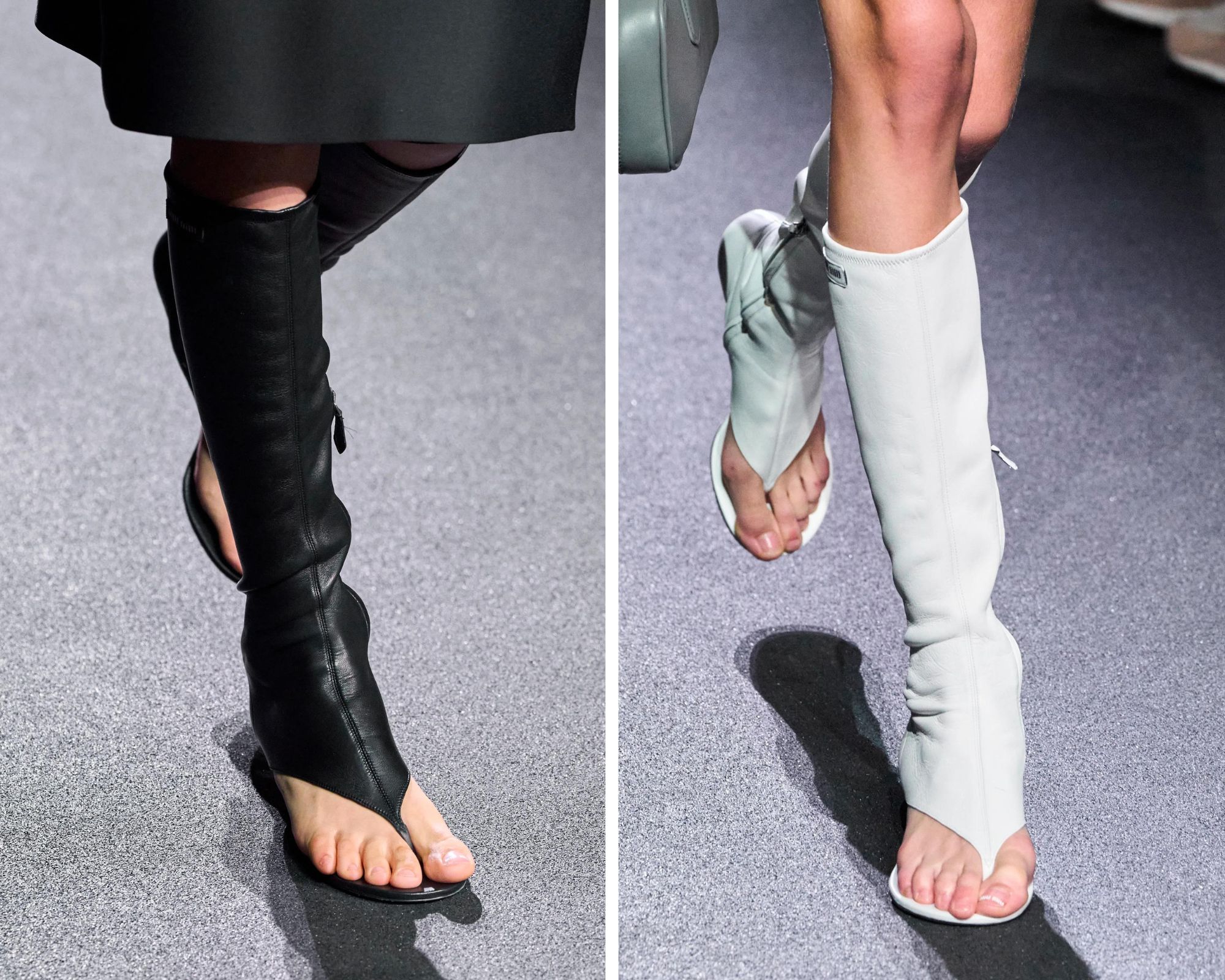 Het is precies het verrassingseffect waar Miu Miu zo bekend om staat. Als ‘jongere, speelsere tegenhanger’ van Prada weet het merk altijd iets fris en frivools te brengen. Daar zijn de teenslipperlaarzen een perfect voorbeeld van. Het leren schoeisel is precies wat je verwacht: een kniehoge laars met een opengewerkte neus, zodat de tenen ontbloot worden. Na de camelkleurige laarzen van het eerste model dat over de catwalk loopt, volgen er meer varianten: van zwart en donkerbruin tot wit en limoengroen. De hakhoogte varieert van plat tot een goede tien centimeter.
