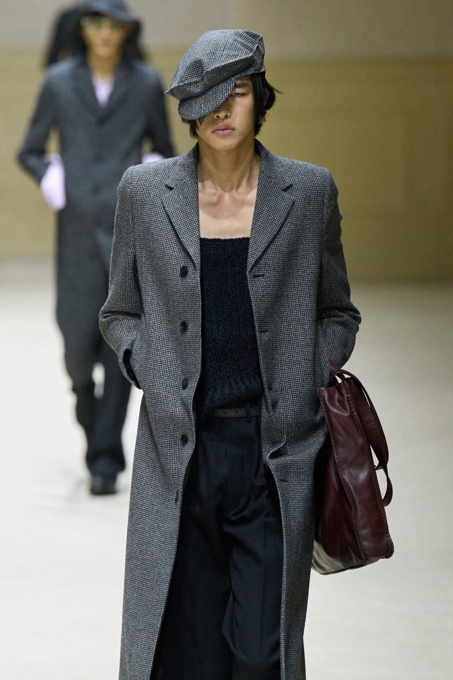 Maar er was nog iets anders dat opviel: de hoedjes die de mannen droegen. Naast vissershoedjes keerde ook een vernieuwde versie van de bakers boy-pet terug in de collectie van Prada. We zagen onder meer een sportieve variant: een felgroen jack met ritssluitingen en een strak ceintuur in de taille, gecombineerd met een bakers boy-pet in exact dezelfde tint. Een andere look toont dezelfde pet in bruin, gestyled bij een trenchcoat met een strakke taille en een bewust verweerde, gekreukte vintage uitstraling. En ook in zwart maakte het petje zijn opwachting, gecombineerd met een lange, donkerblauwe jas en een felrode trui. Een prachtige bruine tas werd nonchalant onder de arm gedragen.