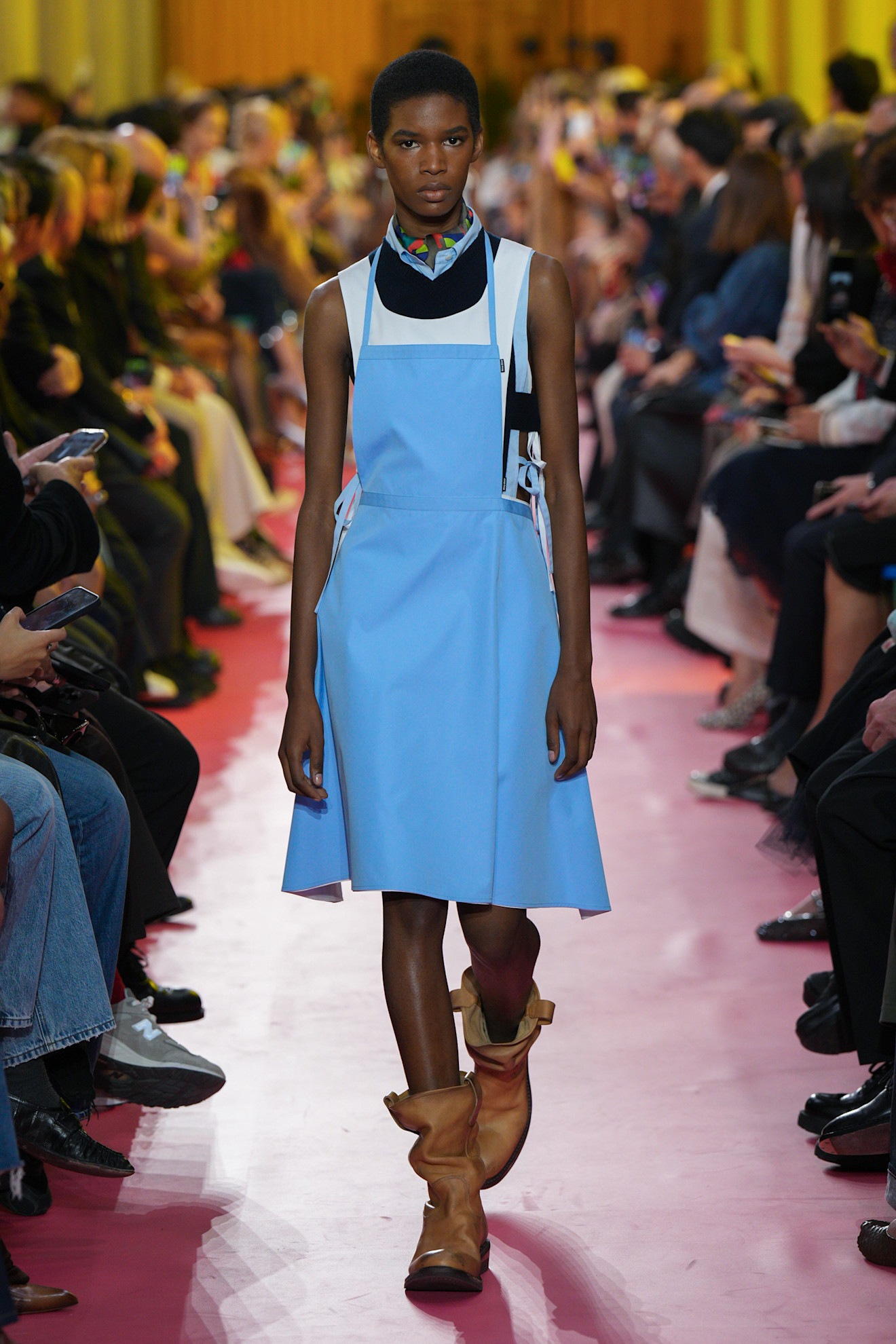 Naast keukenschorten zagen we ook ontwerpen die we associëren met schoonmakerskleding, zoals felgekleurde jurken met een vrolijk bloemetjespatroon en ruches. De Miu Miu-vrouw heeft echter geen dweil in de hand, maar een begeerlijke tas van leer of suède (die zeker niet goed samengaat met schoonmaakmiddelen). Volgens het merk is de collectie “een beschouwing van het werk van vrouwen – hun uitdagingen, tegenslagen en ervaringen. De onzichtbaarheid ervan wordt onder ogen gezien en aangepakt, erkend en gewaardeerd.”