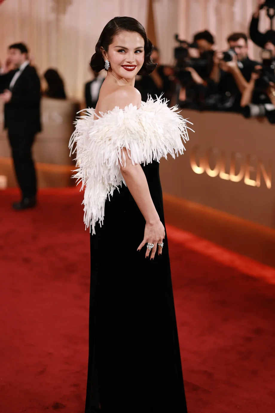 Hoewel haar personage in Only Murders in the Building graag mosterdgeel draagt, bleef Gomez op de rode loper trouw aan haar geliefde zwart-witte kleurenpalet. Ook voor haar vijfde Golden Globe-nominatie koos ze voor deze klassieke combinatie. Ze verscheen samen met haar man Benny Blanco in een zwarte fluwelen jurk met een off-shoulder silhouet, rijkelijk versierd met meer dan 200 veren van organza en zijden chiffon. Dankzij de complexe constructie en het verfijnde borduurwerk werkte het atelier van Chanel in totaal 323 uur aan de creatie.
