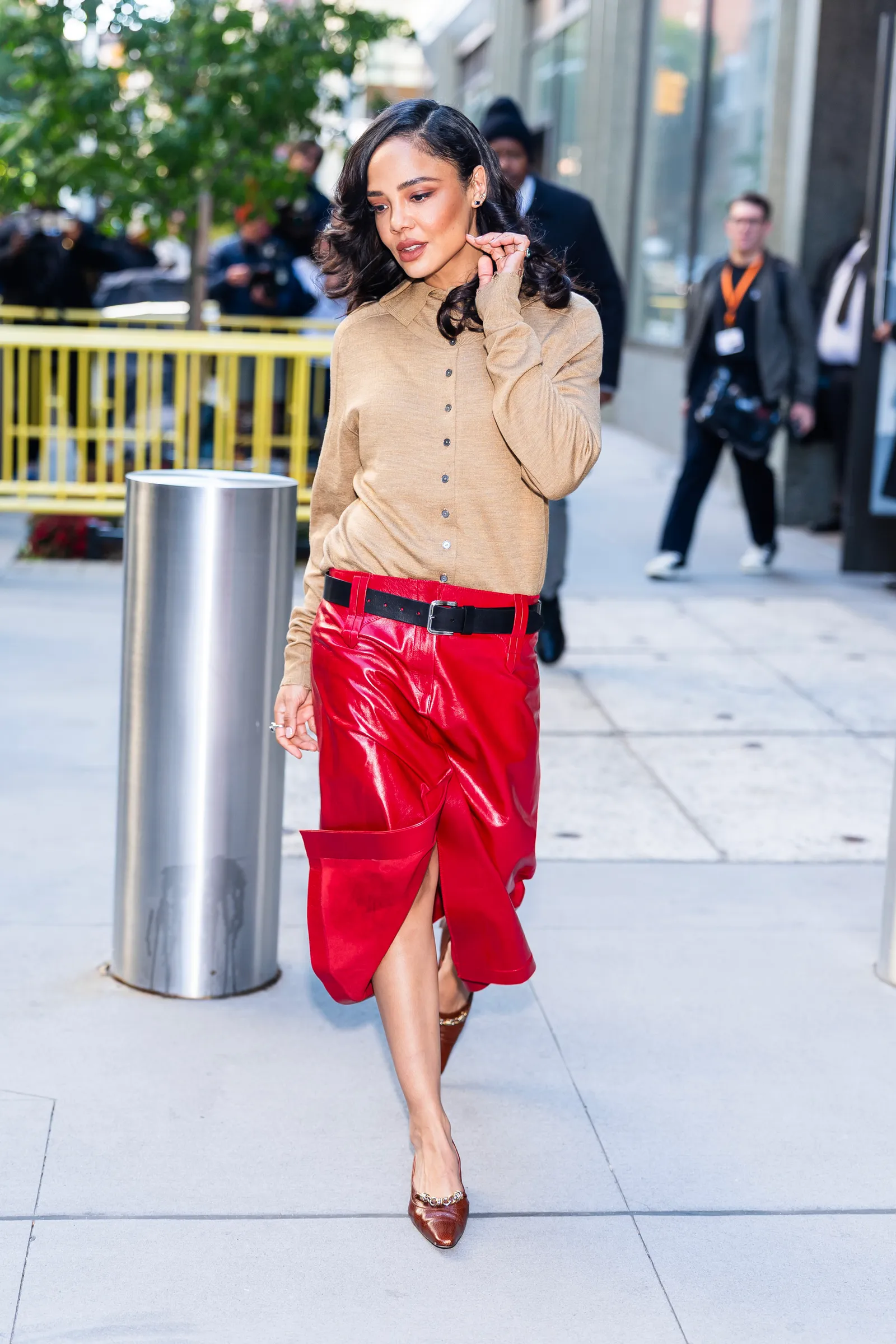 Deze keer werd Thompson gespot in Lower Manhattan in een look die opviel en de belangrijkste trends van het seizoen samenvatte. Zo verscheen de actrice in een glanzende rode midirok met een lage taille, geaccentueerd door een zwarte riem met zilverkleurige gesp – waarmee de actrice bewees de it-girl te zijn die ze is. Daarbij droeg ze donkerrode pumps met metalen ringetjes. Een perfecte keuze, aangezien rode schoenen tot de absolute must-haves van dit najaar behoren.