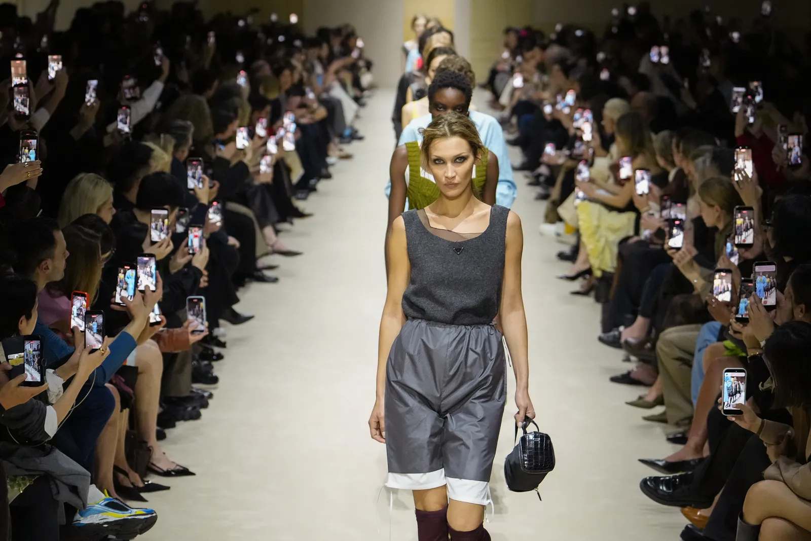 Bella Hadid liep vier keer over de catwalk van Prada