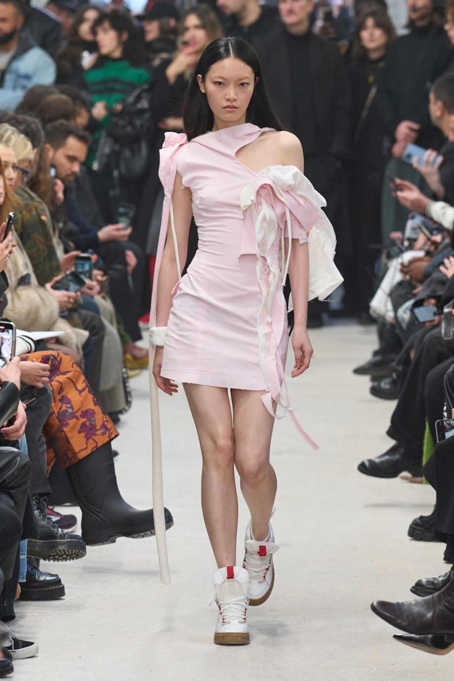 De boho-stijl à la Marant heeft frivole, met ruches en gedecoreerde broeken en jasjes, maar dan wel gecombineerd met een jeans. En dus die wedgesneakers. De afgelopen jaren associeerden we Parijse mode meer met een zwarte, klassieke look; meer het quiet luxury van The Row dat nu ook showt tijdens Parijs Fashion Week. Maar dat beeld verandert nu langzaam weer. Als de pendule van een klok slaat het modebeeld immers elke paar jaar weer de andere kant op.