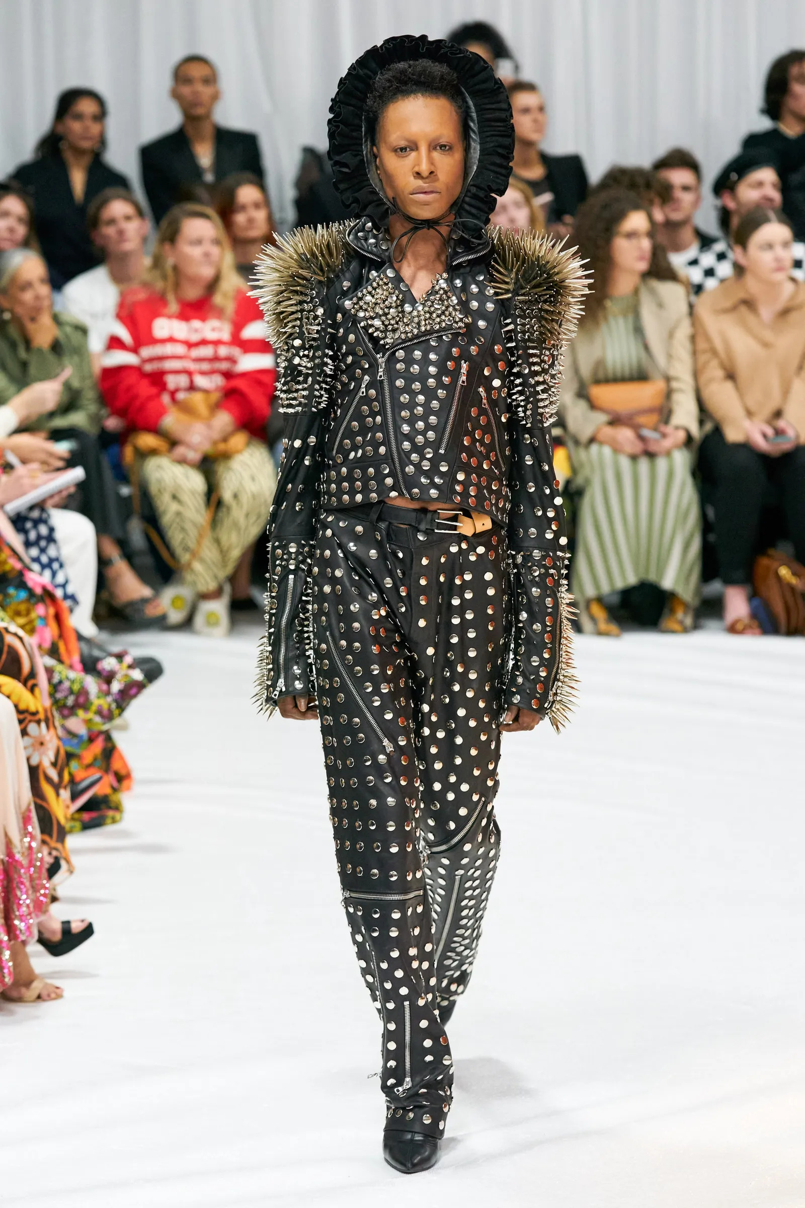 Simone Rocha geeft de traditionele biker een verfrissende update met pofmouwen, statement revers en een zoomlijn die onder de taille uitkomt. Bij Richard Quinn zien we een cropped jacket versierd met studs en spijkers gestyled met een bijpassende broek met rits. En bij Acne Studios is look 12 voorzien van een gekreukt en gebarsten wit bikerjack met geaccentueerde schouders.