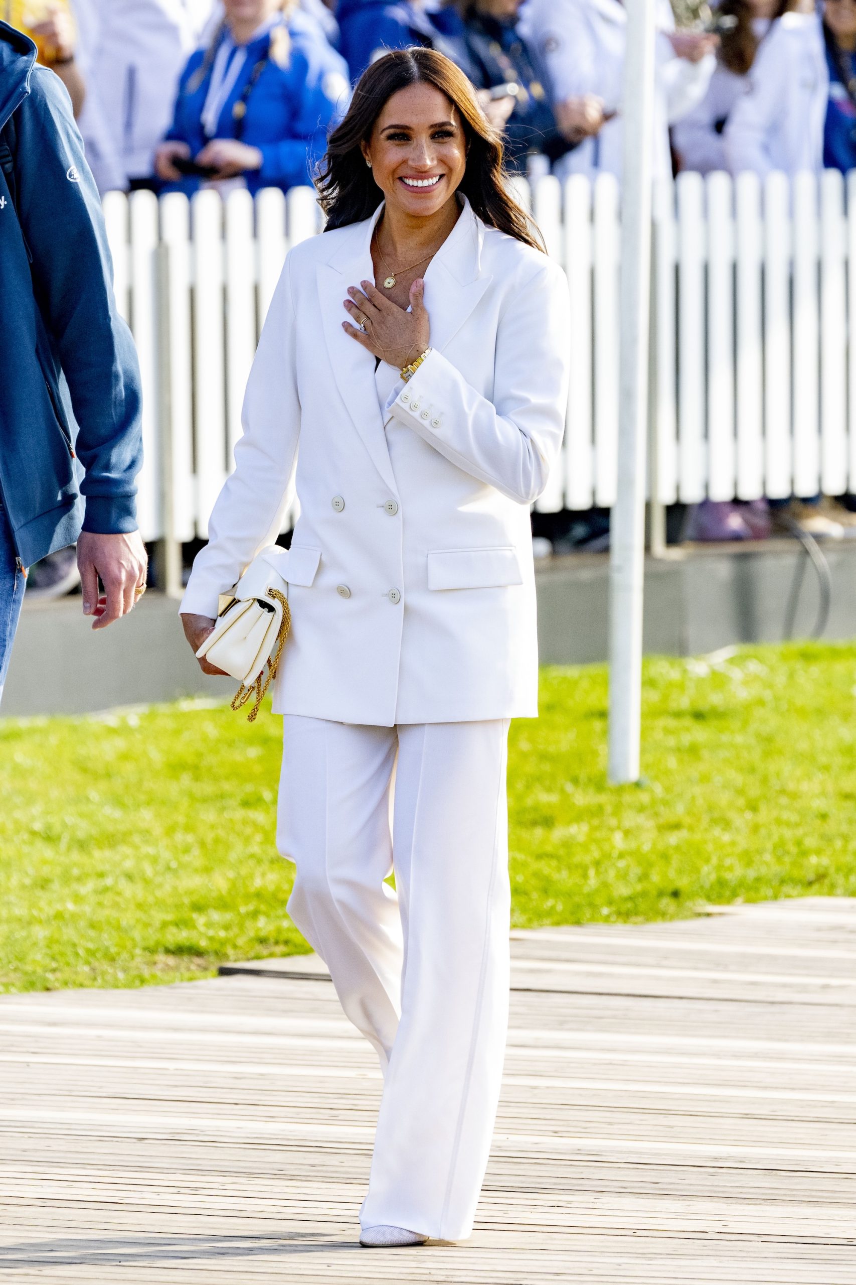 Tijdens Internationale Vrouwendag 2020 in Londen geeft Meghan Markle een geweldige speech. Om haar boodschap van vrouwelijke emancipatie kracht bij te zetten, kiest ze een look bestaande uit ontwerpen van opkomende vrouwelijke ontwerpers. Om te beginnen, de blazer: die is van de Britse ontwerpster Clare Hornby. Daarnaast draagt ze suède pumps van Lorenzo, die de Libanese schoenontwerpster Jennifer Chamandi heeft ontworpen. En tot slot de tas: die is van de Koreaanse modeontwerpster Rejina Pyo.