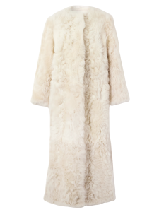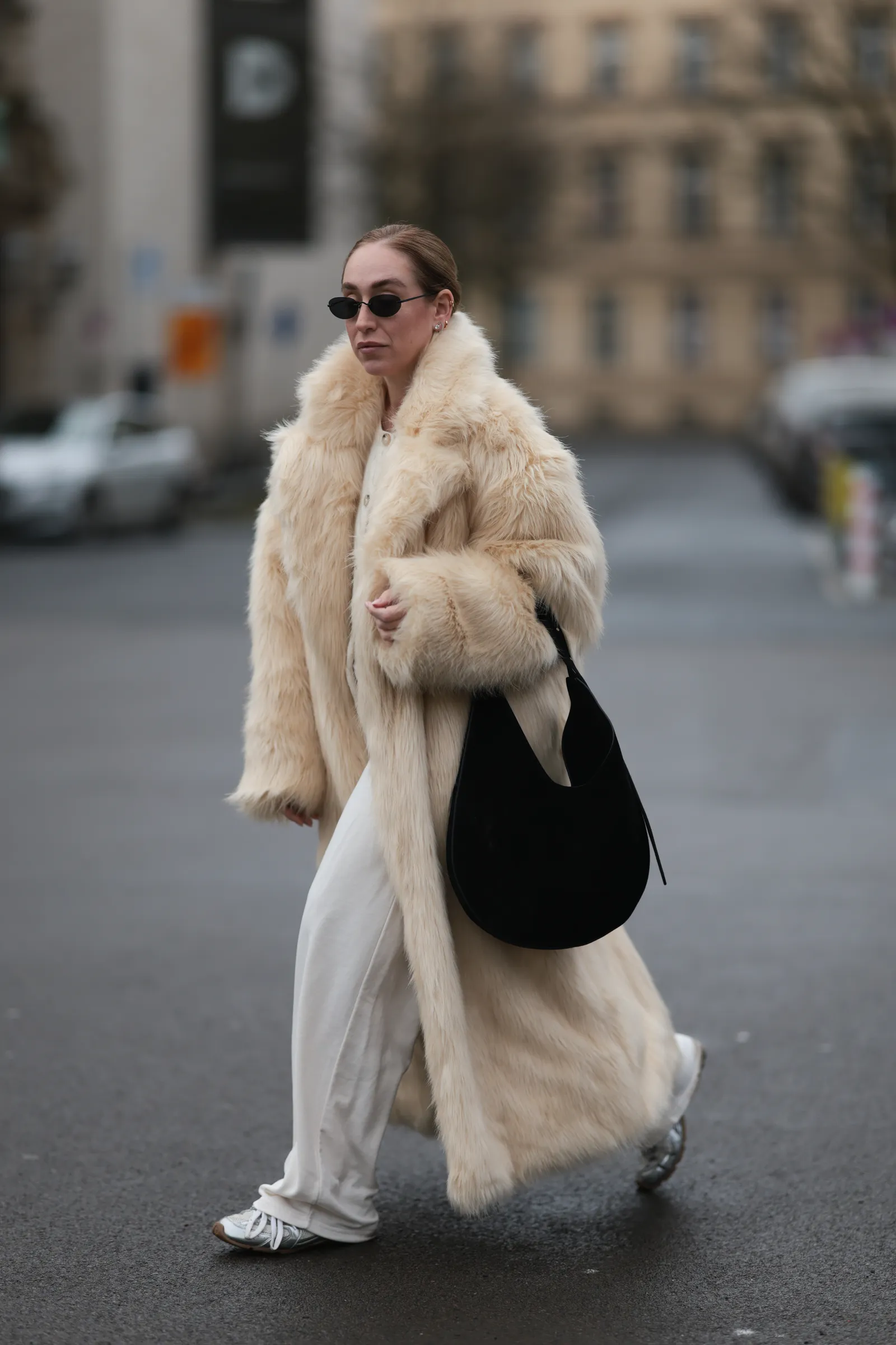 Een lange, omhullende, harige jas is een van de meest gewilde bovenkledingstukken van 2026 en bepaalt de look met zijn zachte, glanzende textuur. Daaronder een lichtgekleurde jumpsuit en sneakers maken de outfit lichter en comfortabeler, maar met die essentiële vleugje coolness.