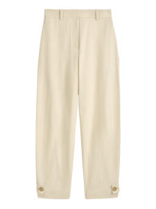 De jas met hoge kraag bepaalt de look met een bijna architectonische, strakke uitstraling. De bivakmuts in dezelfde tint versterkt het monochrome effect. Ook voegt het een eigentijdse, functionele maar zeer stijlvolle noot toe. De bruine broek doorbreekt het wit op een evenwichtige manier en voegt warmte en diepte toe aan het kleurenpalet.
