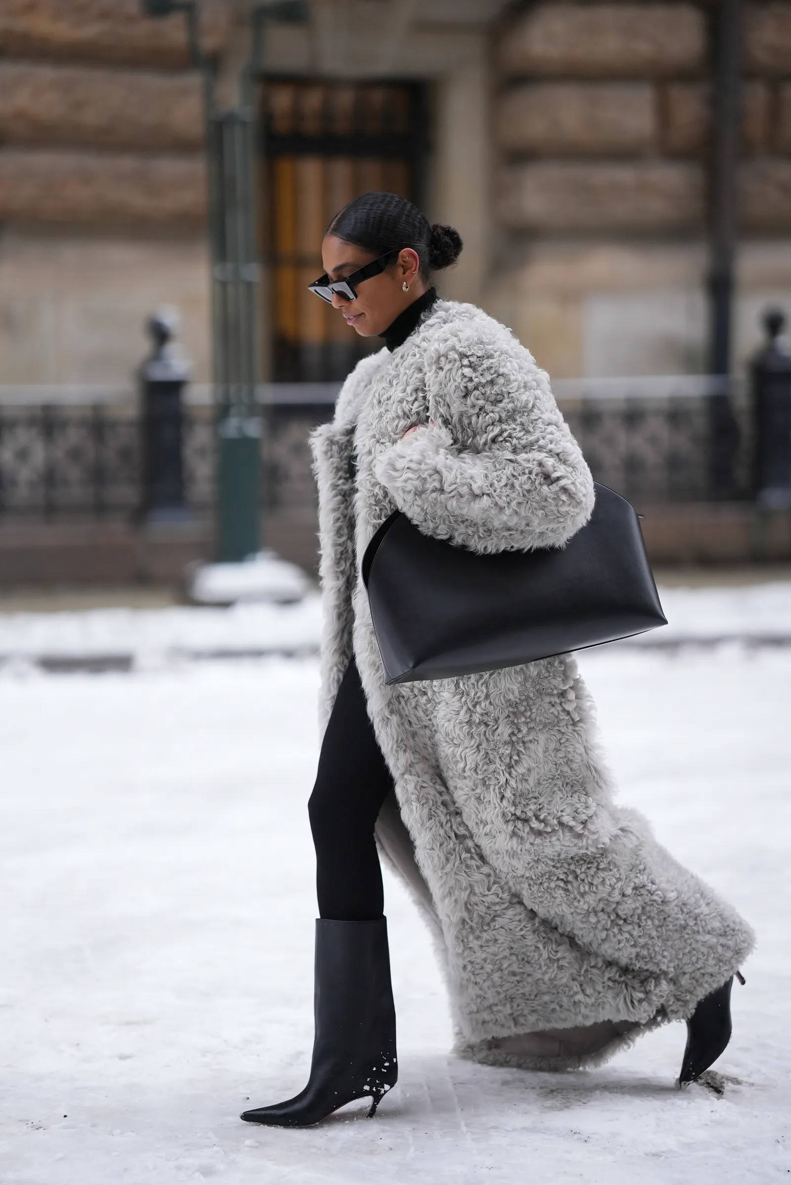 De oversized, lichtgrijze shearlingjas, lang en omhullend, domineert het silhouet met een zacht maar krachtig volume. Daaronder een minimalistische, volledig zwarte look: een aansluitende coltrui, leggings (waaronder een thermische ) en spitse laarzen met een dunne hak, die het figuur slanker laten lijken en de imposante bovenkleding daardoor in evenwicht brengen.