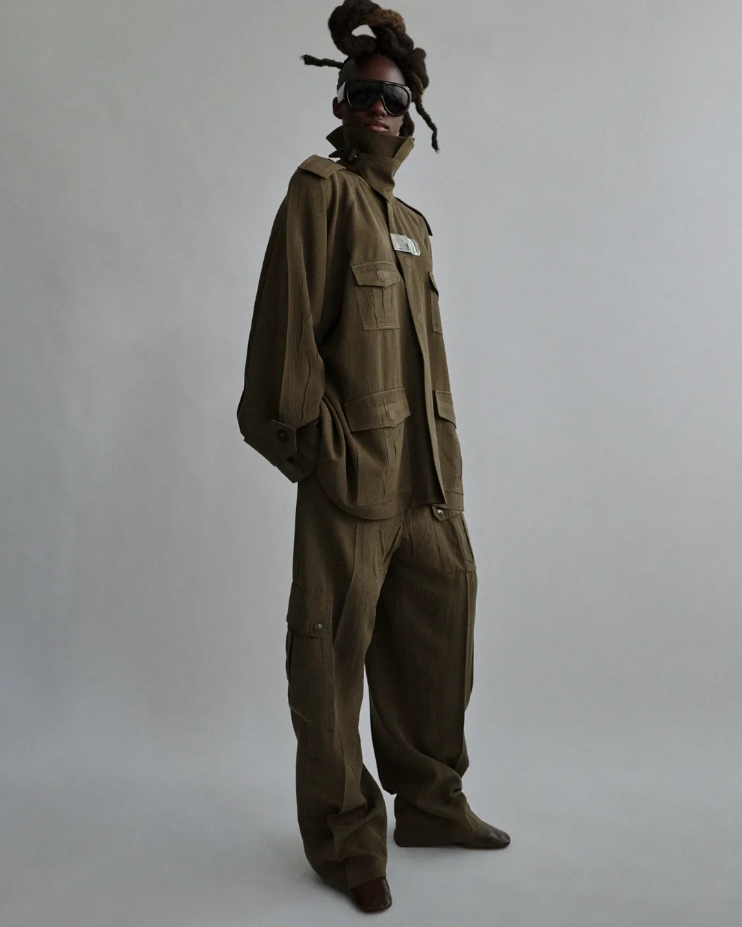 En dan de schouders. Oversized, maar door de ronding nét even anders. Het schuine silhouet van het model met een donkerbruine leren blouson, die in een drop-waisted peplum is geknoopt en met een perfect model broek, zegt alles.